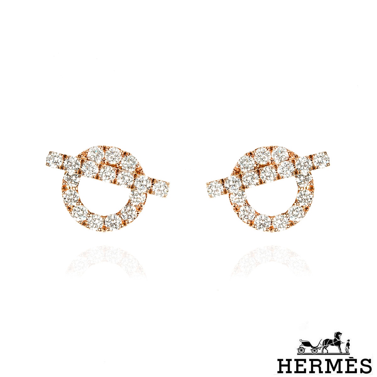 An 18k rose gold diamond bracelet by Hermes from the Finesse collection. The bracelet features a circular motif with a bar across it set with pave round brilliant cut diamonds. The 17 diamonds have a total weight of 0.46ct. It features a single round brilliant cut diamond in a rubover setting at the bracelet's closure. Measuring 6.5 inches in length, it is a Hermes size 'ST', finishes with a snap clasp and has a gross weight of 3.9 grams.