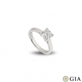 A beautiful 18k white gold diamond solitaire ring. The ring is set to the centre with a cushion modified brilliant cut diamond weighing 1.66ct, I colour and VS1 clarity. The 3mm white gold band tapers up into a classic four claw setting. The ring has a gross weight of 4.45 grams and is currently a size M but can be adjusted for the perfect fit.