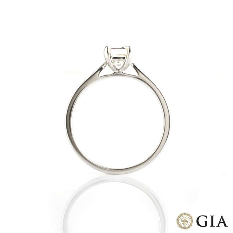 A classic emerald cut single stone diamond ring in 18k white gold. The emerald cut diamond weighs 0.67ct and is set within four claws. The diamond is F in colour and the clarity is VVS1. The mount is slightly tapered to excentuate this oustanding diamond. The ring is currently a size M but can be adjusted for the perfect fit.