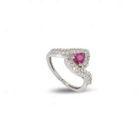 A unique 18K white gold pear cut diamond ring. The halo engagement ring is set to the centre with a pear cut diamond weighing 0.31ct and is a natural fancy light purplish pink colour with even distribution. Complementing the centre diamond are 26 round brilliant cut diamonds pave set to the halo and shoulders with an approximate weight of 0.24ct, G-H colour and VS-SI clarity. The ring has a gross weight of 3.15 grams and is currently a size L but can be adjusted for the perfect fit.