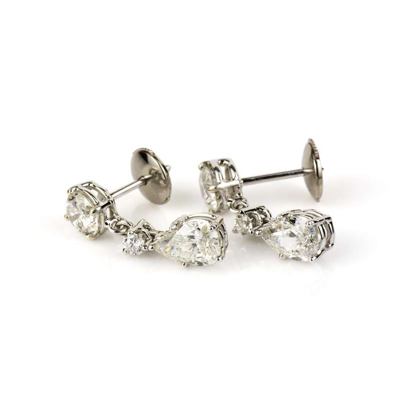 A pair of round brilliant and pear shape diamond drop earrings set in 18k white gold. Each round brilliant cut top weighs 0.79ct is F colour and VVS2 clarity. These diamonds are certified with ERD reports dated 2013 A733687/A733682. The suspending 0.10ct round brilliant diamond leads to the pear shape drop each weighing 1.00ct, G/H Colour, VS/SI clarity. Total diamond weight of earrings 3.78ct.