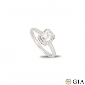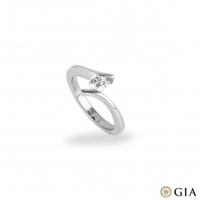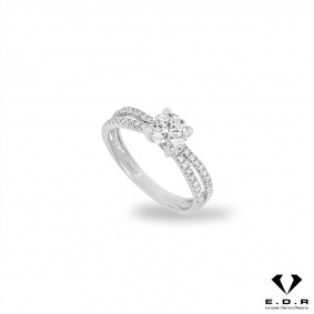 A beautiful 18k white gold diamond engagement ring. The split shank ring is set to the centre with a round brilliant cut diamond in a four claw mount weighing 0.59ct, colour F and VS1 clarity. The central stone is complemented by two rows of round brilliant cut diamond set shoulders totalling 0.30ct, G-H colour and VS clarity. The ring tapers down from 4.58mm to 2.70mm, has a gross weight of 4.00 grams and is currently a size N but can be adjusted for a perfect fit.
