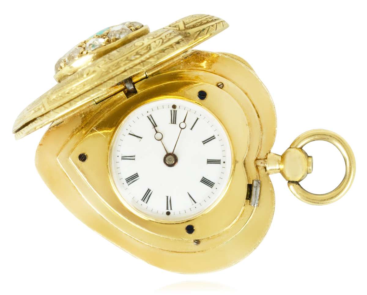 A Gold Emerald & Diamond Heart Shape Keywind Cylinder Full Hunter Pendant Watch C1840