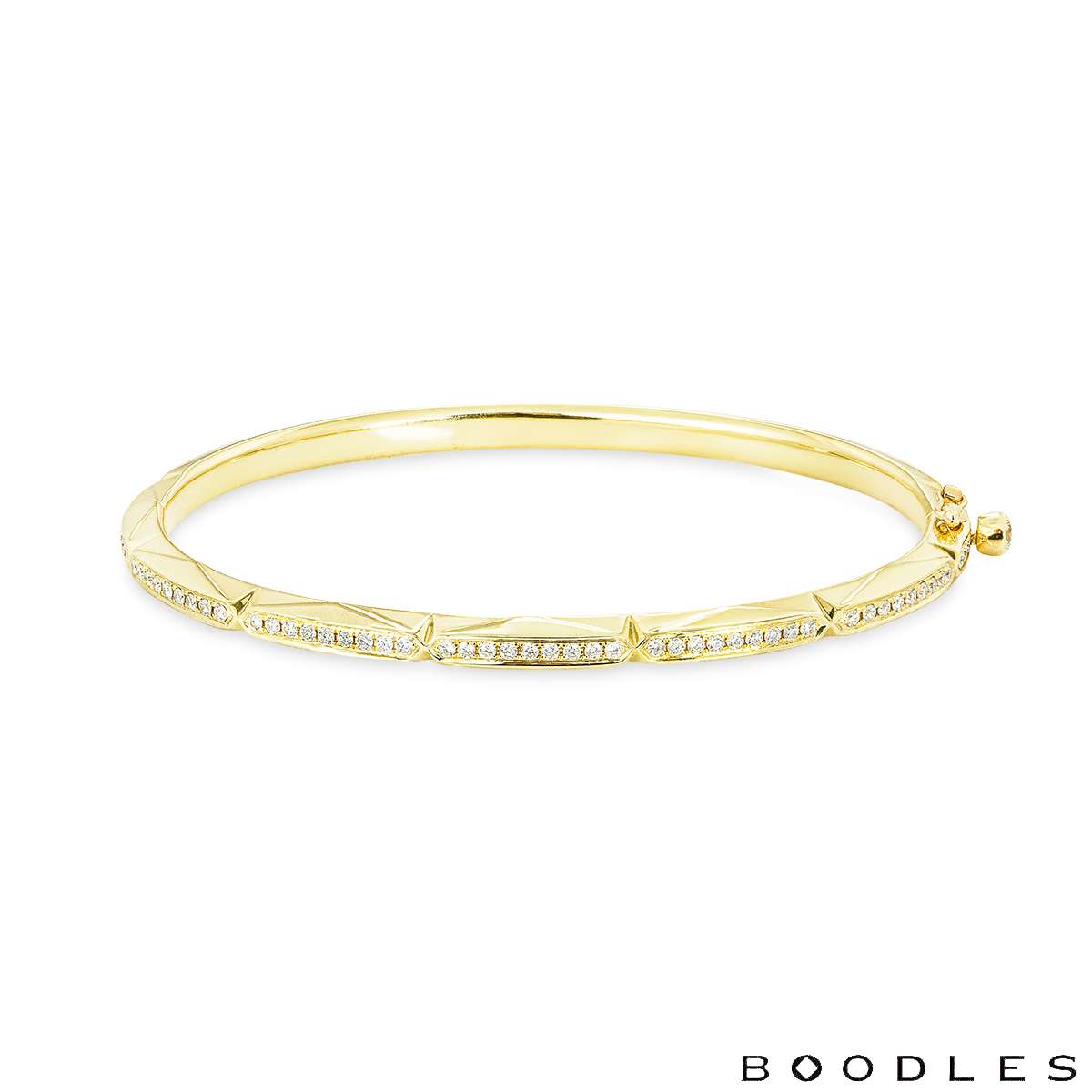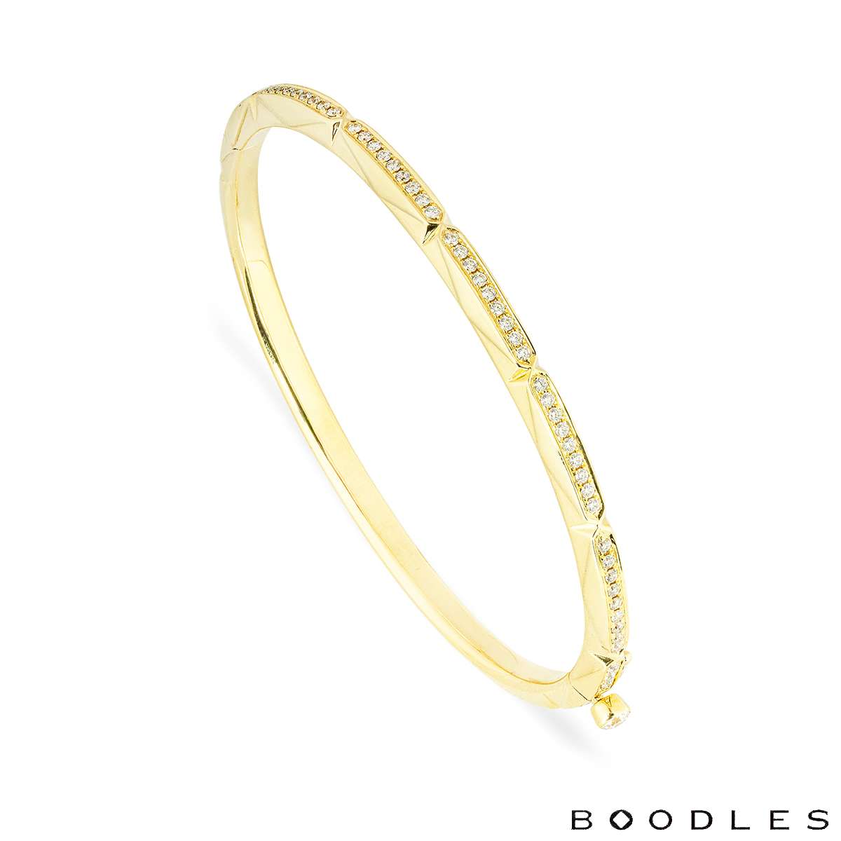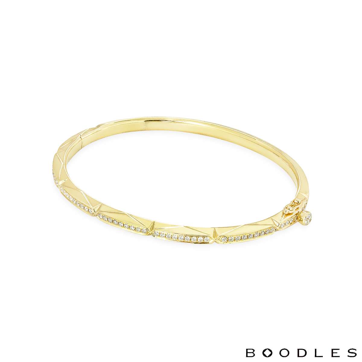 An 18k yellow gold bracelet by Boodles from the Art Deco Jazz collection. The bangle is composed of seven Jazz motifs, each set with round brilliant cut diamonds and accented with faceted detailing along the outer edges. Designed to fit a wrist size of up to 6.75 inches, it is secured with a hinged box clasp and additional figure eight safety fitting. The clasp is further enhanced with a single bezel set round brilliant cut diamond. In total, the bangle is set with 58 round brilliant cut diamonds, with an approximate combined weight of 0.67 carats, all well matched in colour and clarity. The bangle measures 4mm in width and has a gross weight of 16.79 grams.