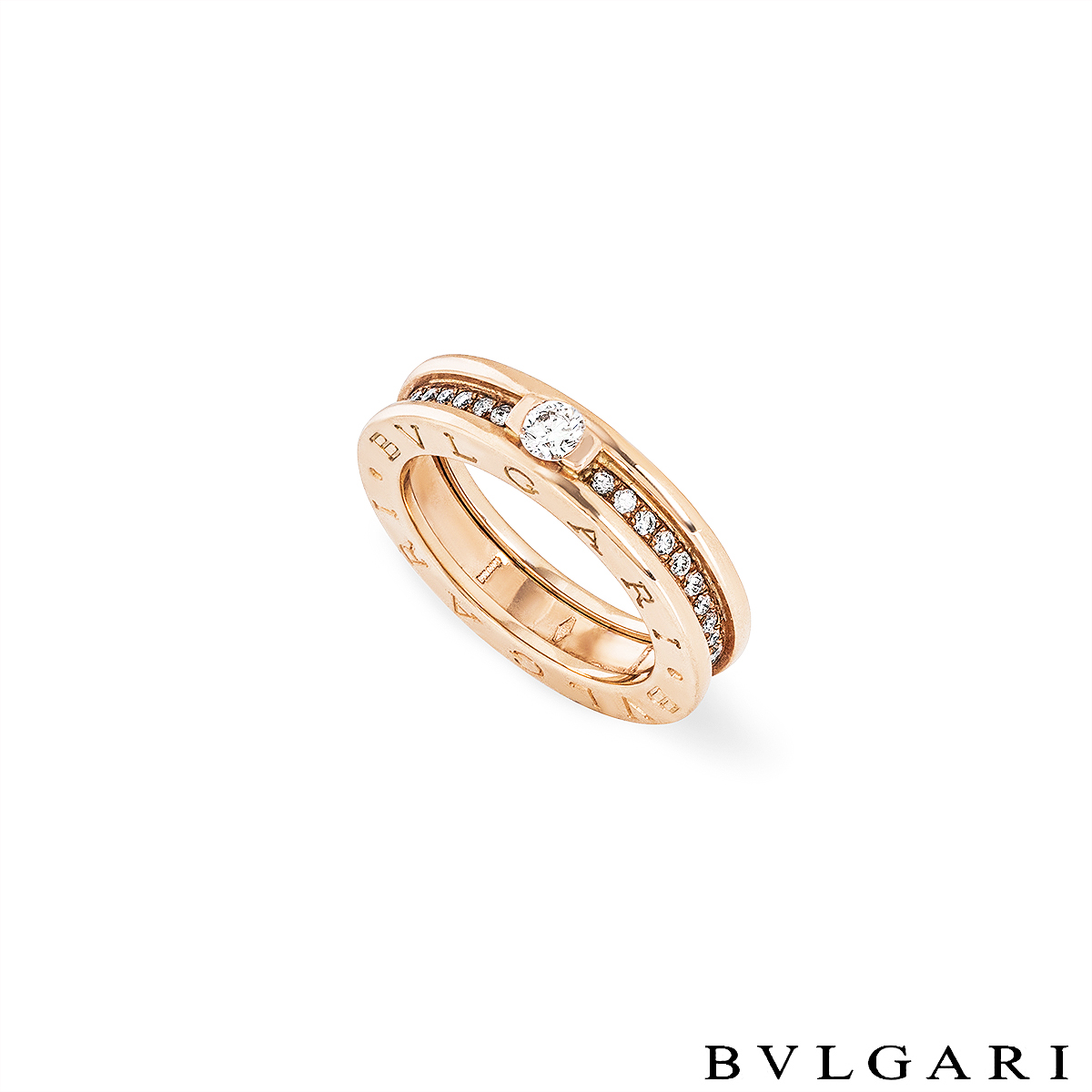A striking 18k rose and white gold diamond ring by Bvlgari from their Labyrinth B.Zero1 collection. The ring comprises of the signature spirals, alternating between rose and white gold and accompanied by a diamond set border. There are 108 round brilliant cut diamonds pave set with an approximate total weight of 0.78ct, F-G colour and VS clarity. Engraved on the outer edge on both sides is the signature "BVLGARI BVLGARI". The 11mm band is a size 58 and has a gross weight of 11.76 grams.
