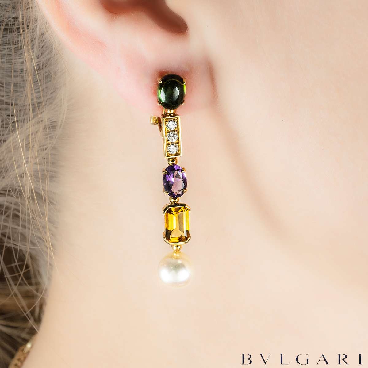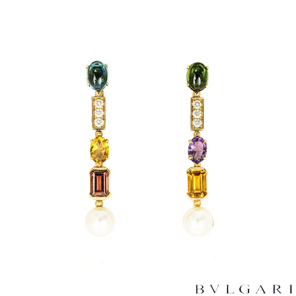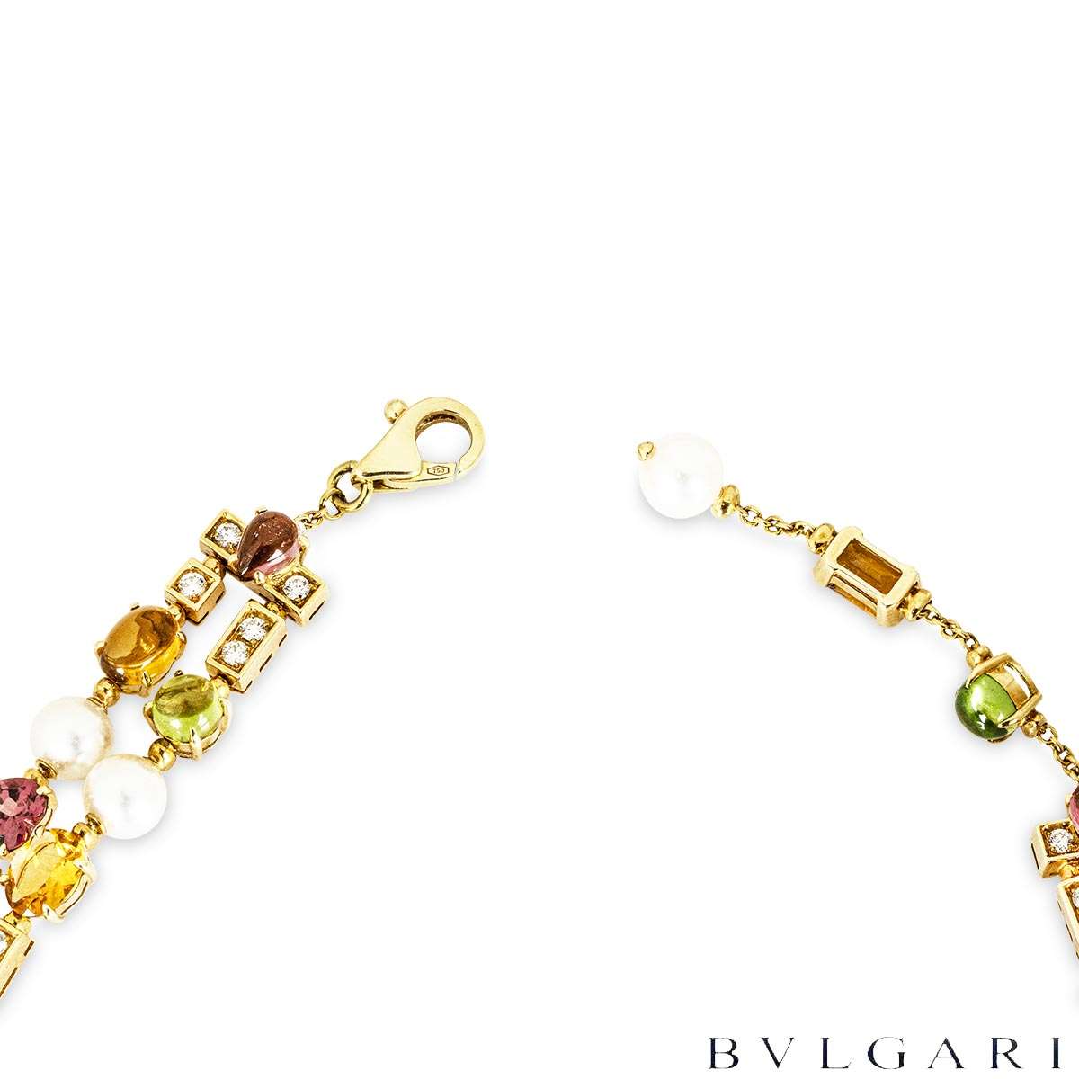 A striking 18k yellow gold multi-gem suite by Bvlgari from the Allegra Coriandoli collection. The suite showcases a vibrant arrangement of tourmalines, peridots, aquamarines, amethysts and citrines in a variety of cuts, 7mm white pearls interspersed with polished gold bar motifs set with 86 round brilliant-cut diamonds totalling approximately 4.35 carats.