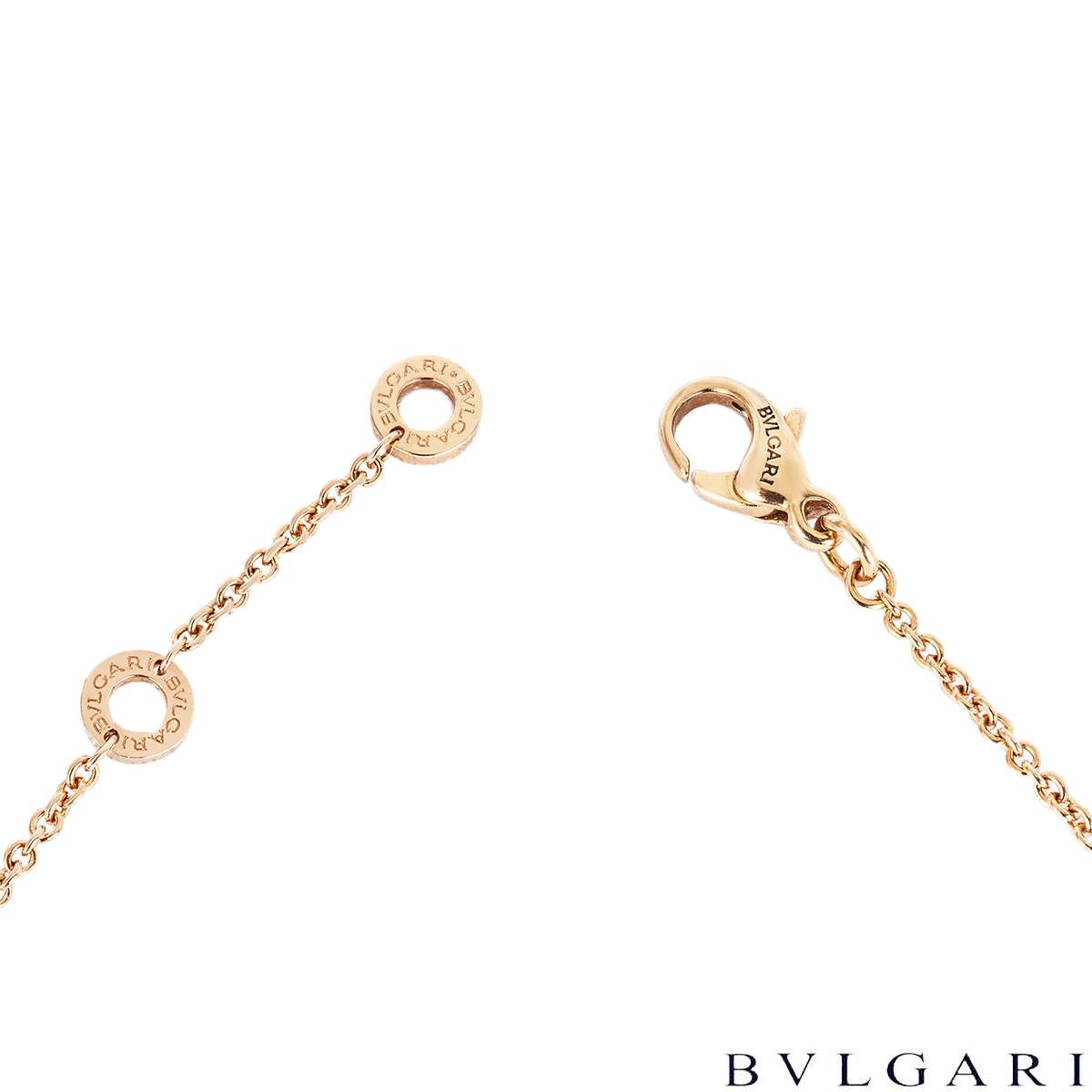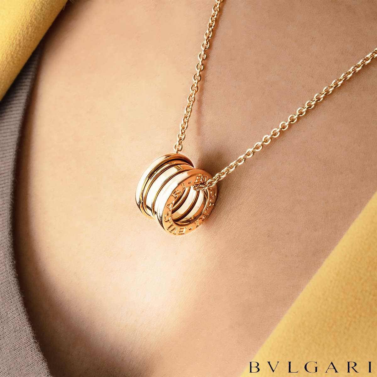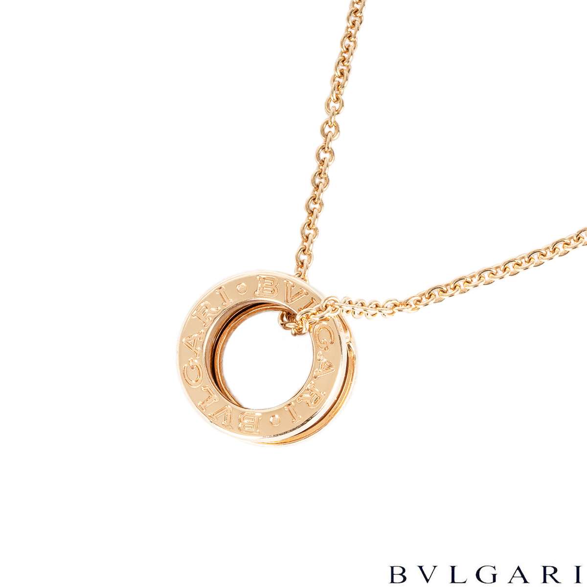 A harmonious 18k rose gold Bvlgari pendant from the B.Zero1 collection. The pendant comprises of a central spiral between two open discs engraved with the iconic 'Bvlgari Bvlgari' logo on either side, the pendant height is 15mm. The pendant is complemented by a 18 inch chain that finishes with a lobster clasp and has a gross weight of 14.3 grams.