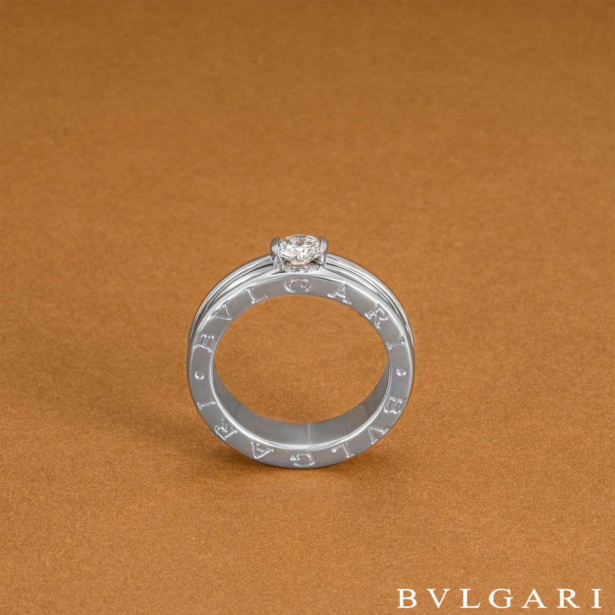 An 18k white gold diamond set Bvlgari ring from the B.Zero1 collection. Set to the centre of the ring is a 0.35ct round brilliant cut diamond in a rubover setting, F colour and VS1 clarity. The ring is further complemented with the signature 'Bvlgari Bvlgari' engraved to the outer edges. The ring is a size K and has a gross weight of 6.72 grams.