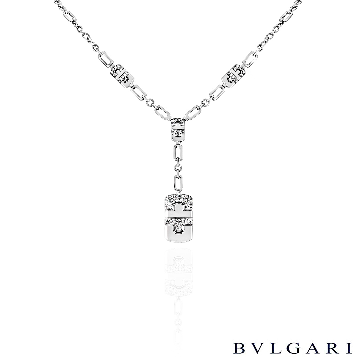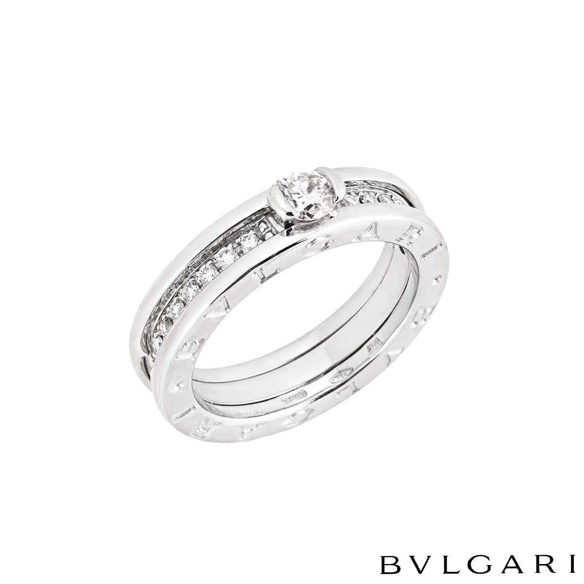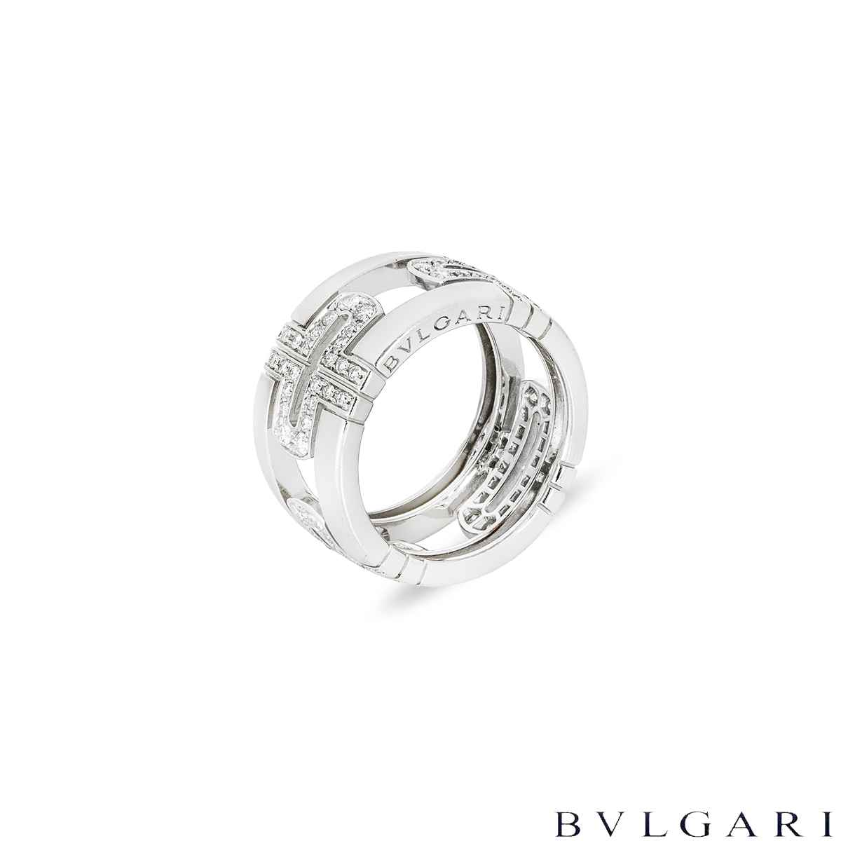 An 18k white gold diamond set Parentesi ring by Bvlgari. The ring features 4 lozenge-shape panels set to the outer edge, each pave set round with brilliant cut diamonds, with a total weight of approximately 0.56ct. The ring measures 11mm in width and is a size 52, with a gross weight of 8.5 grams.