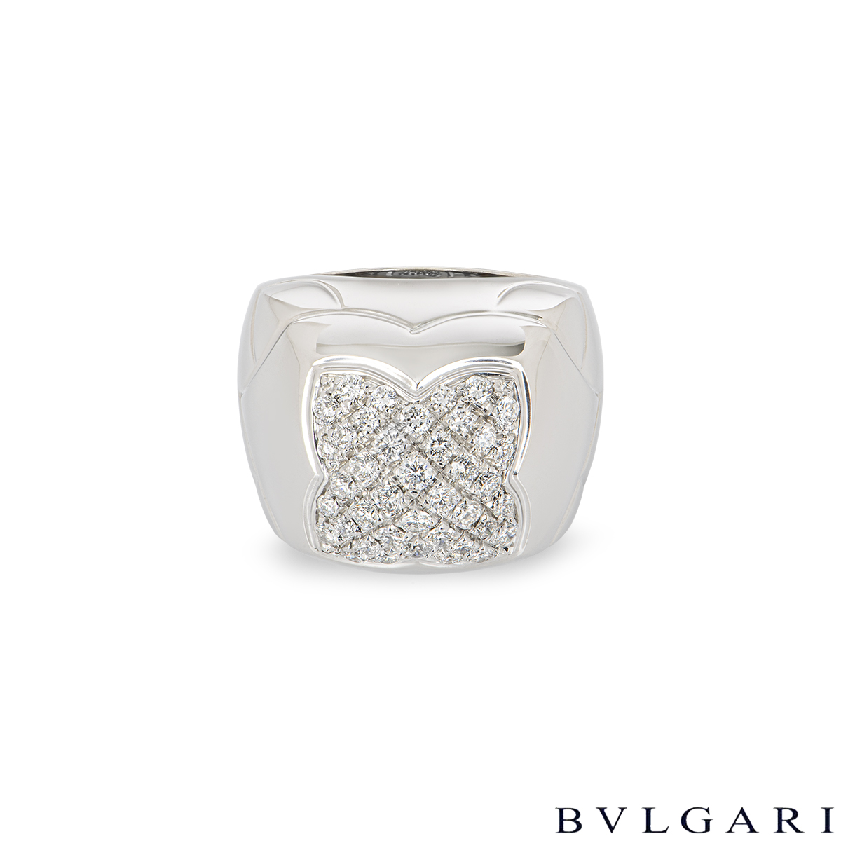 A beautiful 18k white gold diamond ring by Bvlgari from the Pyramid collection. The ring features a pyramid design with 40 round brilliant cut diamonds pave set to the centre in a quatrefoil motif, totalling approximately 0.75ct. The ring measures 18.5mm in width and tapers down to 4.7mm, is a size L and has a gross weight of 13.85 grams.