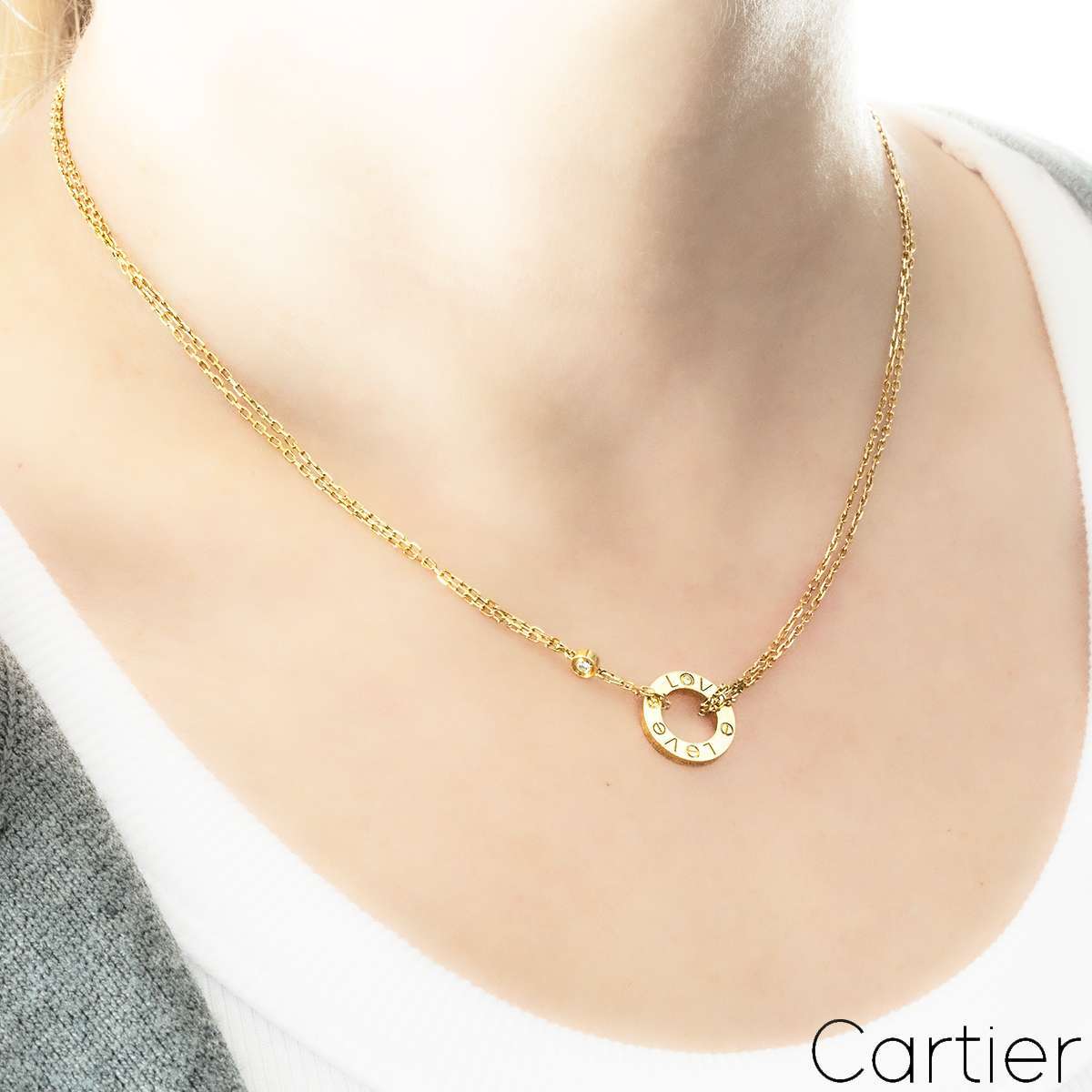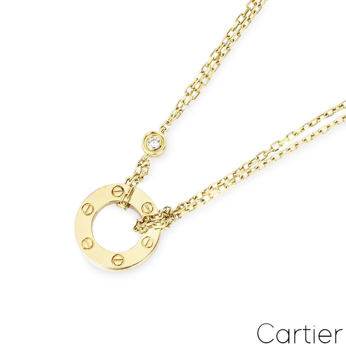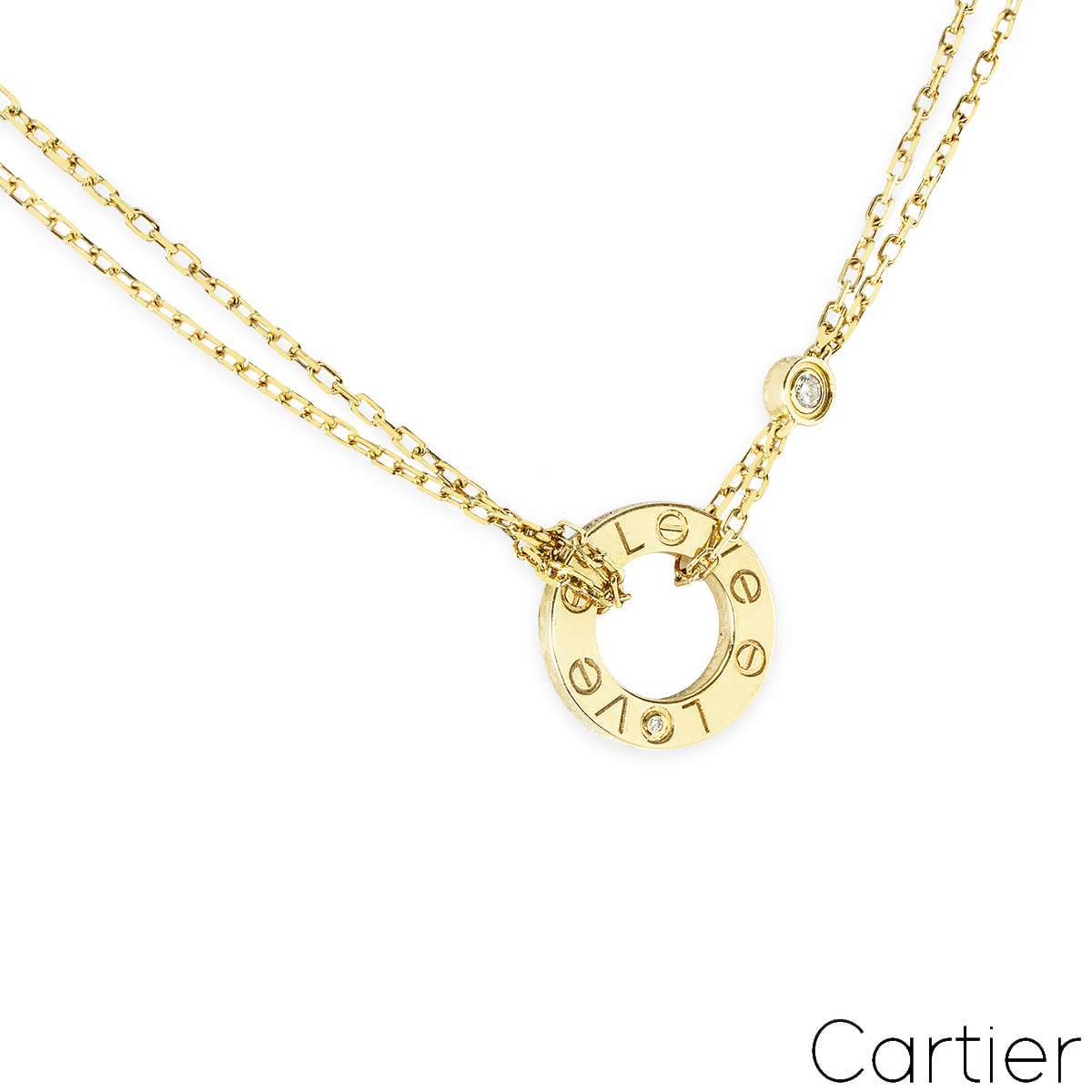 A delicate 18k yellow gold necklace from the Cartier Love collection. The necklace features a double yellow gold chain knotted to an open circular motif engraved with 'LOVE', the 'O' is set with a single round brilliant cut diamond. The necklace is also set with a single round brilliant cut diamond, in a rub-over setting, the total diamond weight is approximately 0.03ct. The necklace features a lobster clasp and measures 16 inches in length with a gross weight of 6.2 grams.