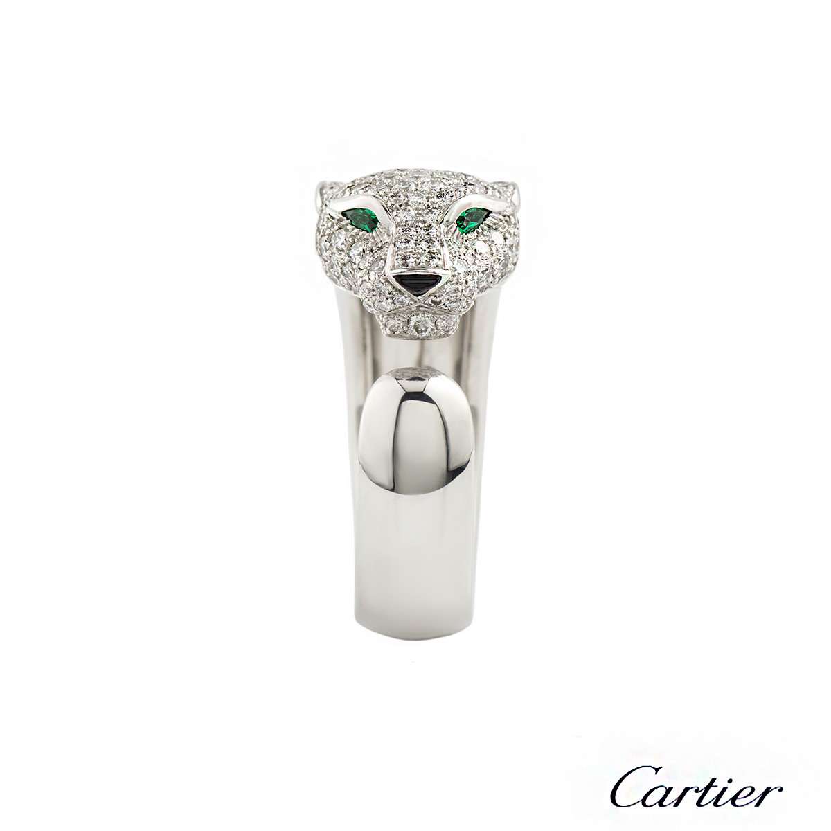 A gorgeous 18k white gold Cartier diamond, onyx and emerald ring from the Panthere De Cartier collection. The ring is composed of a Panthere head motif, pave set with 137 round brilliant cut diamonds totalling 1.15ct, F+ colour and VS+ in clarity, accentuated by two emeralds set as the eyes and onyx as the nose. The Panthere body wraps around three quarters of the finger to make up the ring. The ring measures 6mm in width and is a size L and has a gross weight of 13.8 grams.