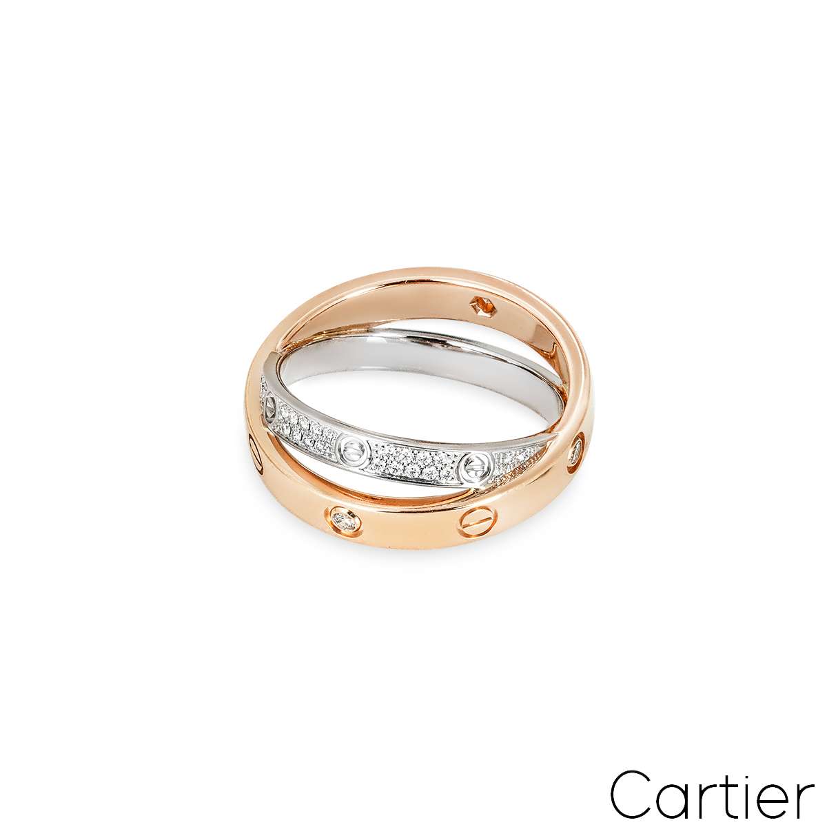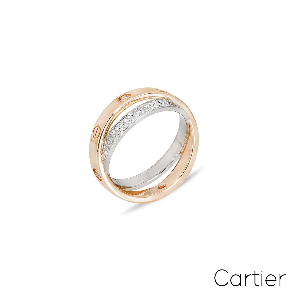 An 18k bi-colour gold double pavé ring by Cartier from the iconic Love collection. Crafted in white and rose gold, the ring features Cartier’s signature screw motif, with 4 round brilliant‑cut diamonds set into the rose gold band and 48 pavé‑set round brilliant‑cut diamonds adorning the white gold band. The ring is a size N and has a gross weight of 6.7 grams.