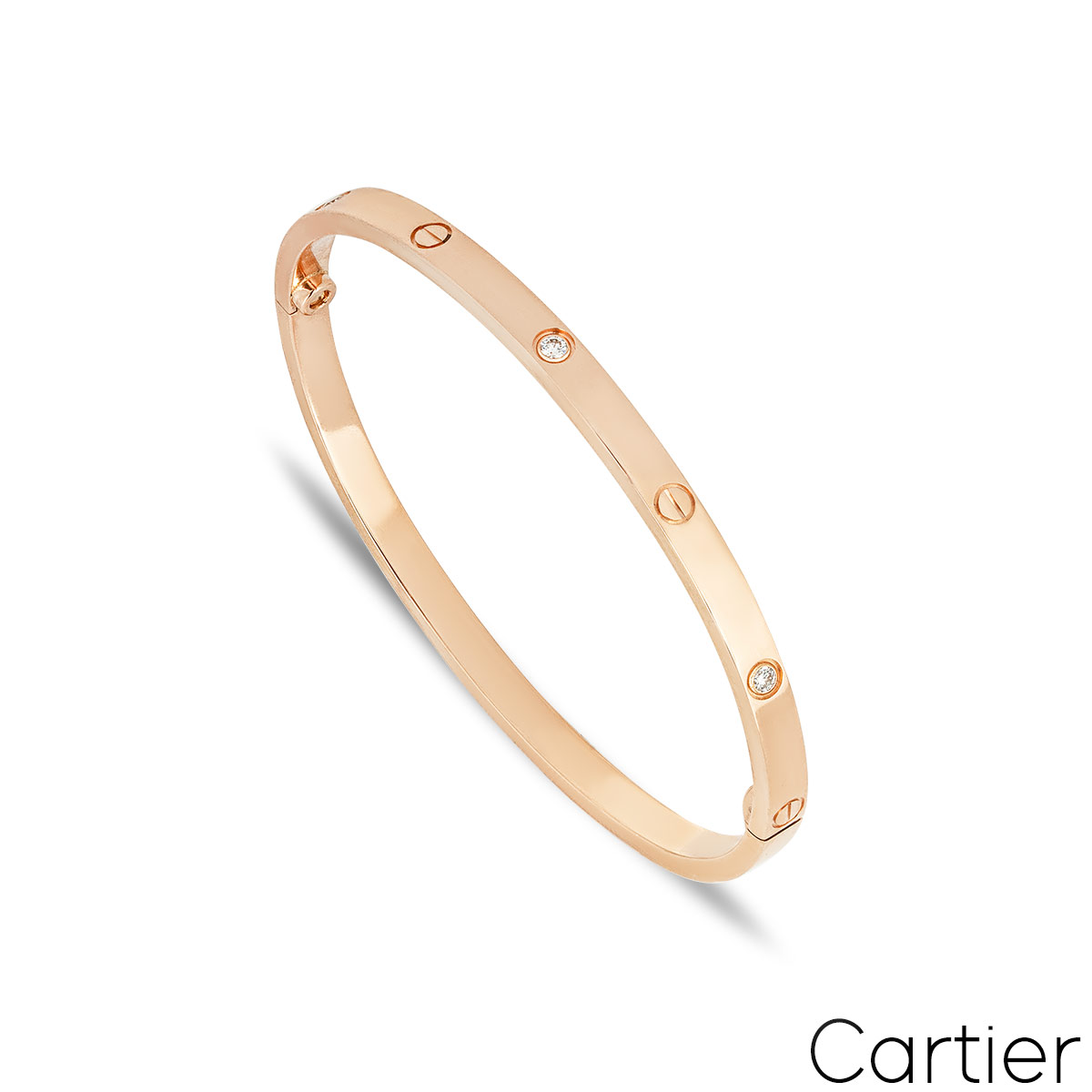 A beautiful 18k rose gold Cartier bracelet from the Love collection. The bracelet comprises of 6 round brilliant cut diamonds alternating with the iconic screw motifs along the outer edge with a total weight of 0.15ct and features a single screw and hinge fitting. This is the SM version of the love bracelet. The bracelet is a size 15 and has a gross weight of 16.0 grams.