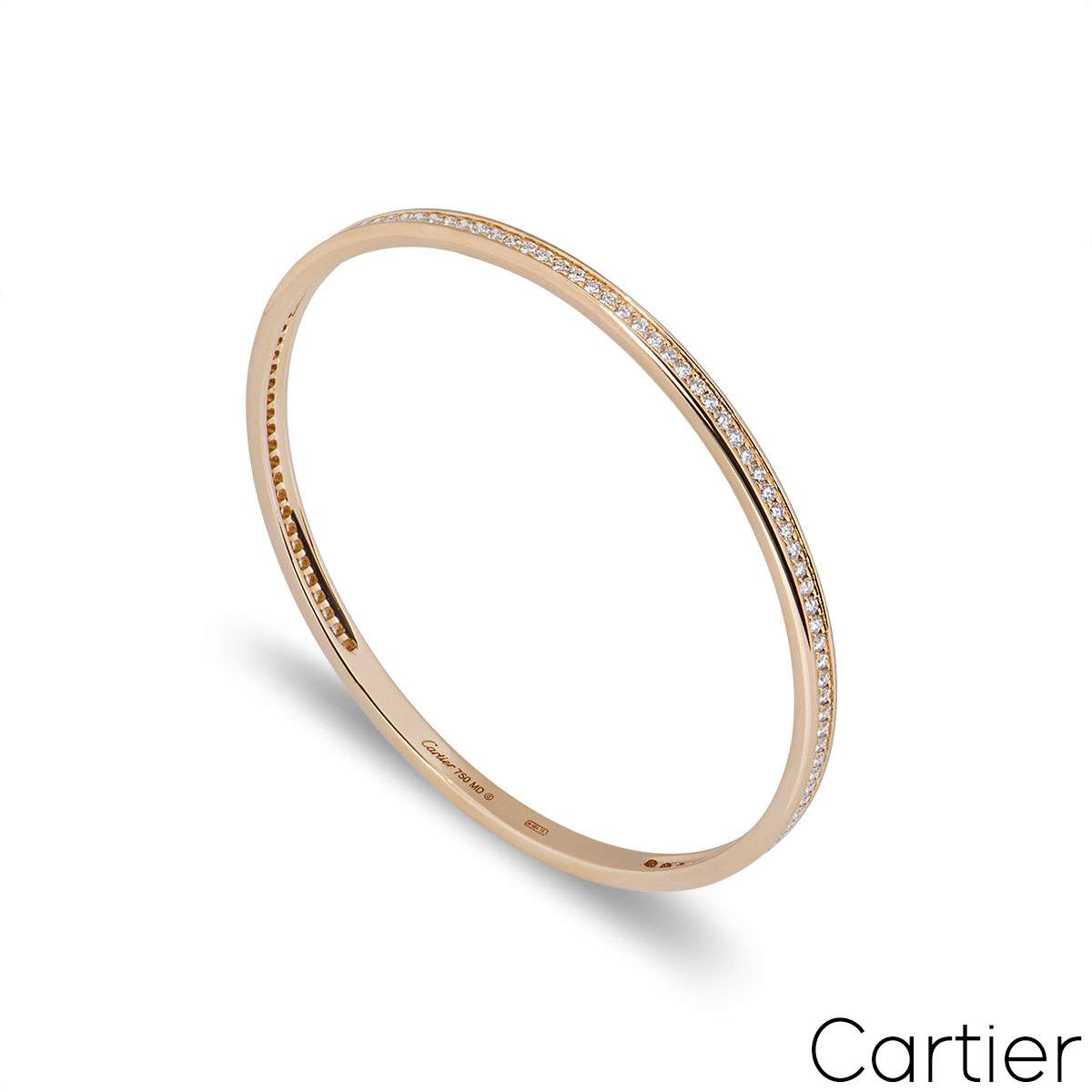 An 18k rose gold diamond set bangle by Cartier. The bangle features approximately 114 round brilliant cut diamonds totalling 2.28ct. The 3.8mm wide bangle has a circumference of 19.5cm and has a gross weight of 18.7 grams.