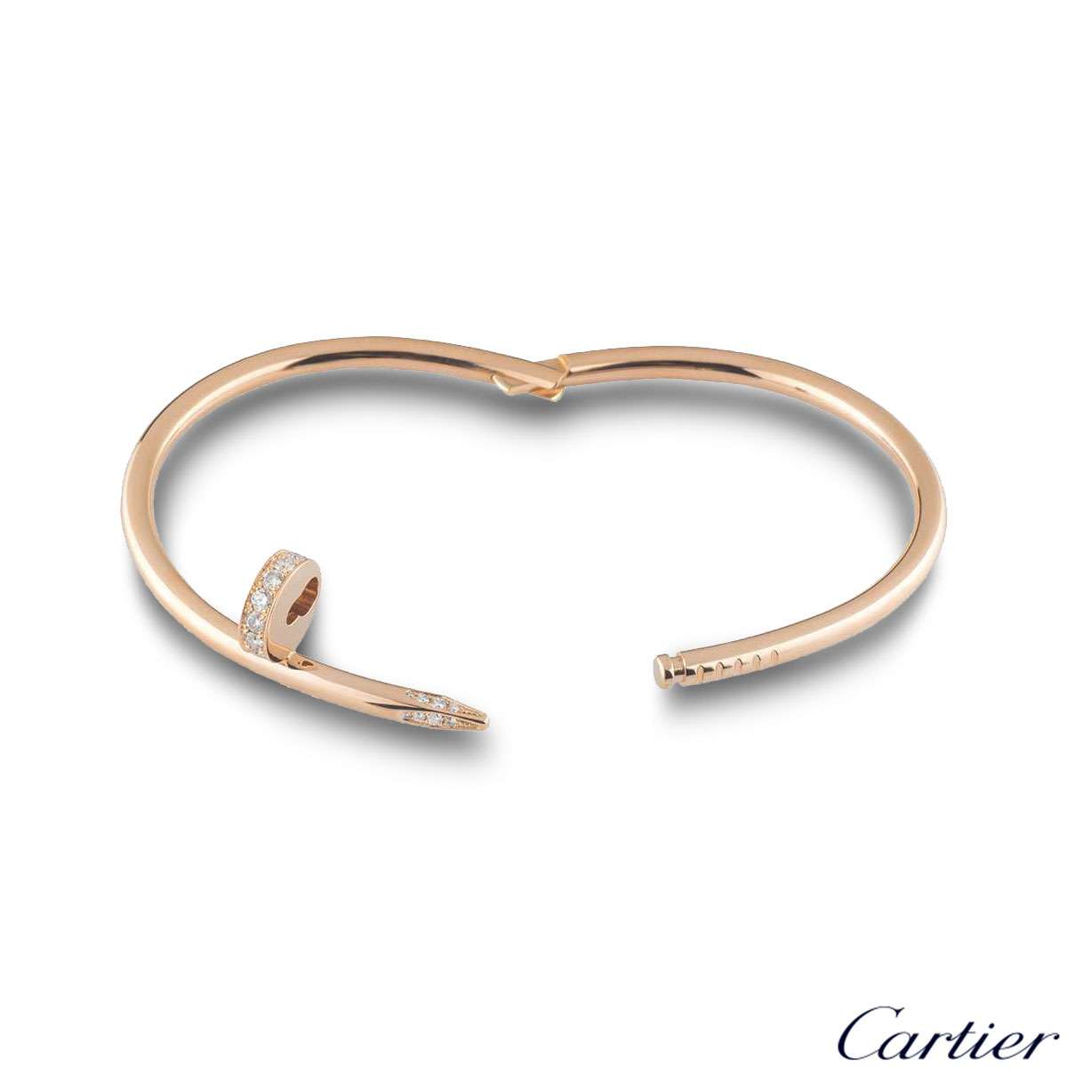 An iconic 18k rose gold Cartier diamond bracelet from the Juste Un Clou collection. The bracelet is in the style of a nail and has 27 round brilliant cut pave diamonds set in the head and tip, totalling 0.54ct. The diamonds are predominantly F colour and VS clarity. The bracelet is size 17 and features the old clasp fitting with a gross weight of 31.36 grams.