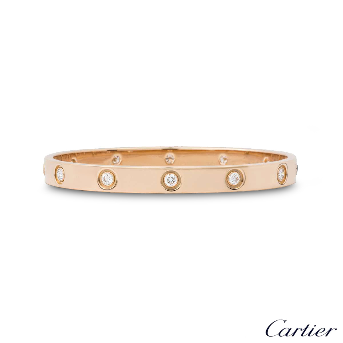 An iconic 18k rose gold full diamond Love bracelet by Cartier. The bracelet is set with 10 round brilliant cut diamonds circulating the outer edge throughout totalling 0.96ct. The bracelet is a size 19 and features the new style screw fitting and has a gross weight of 32.8 grams.