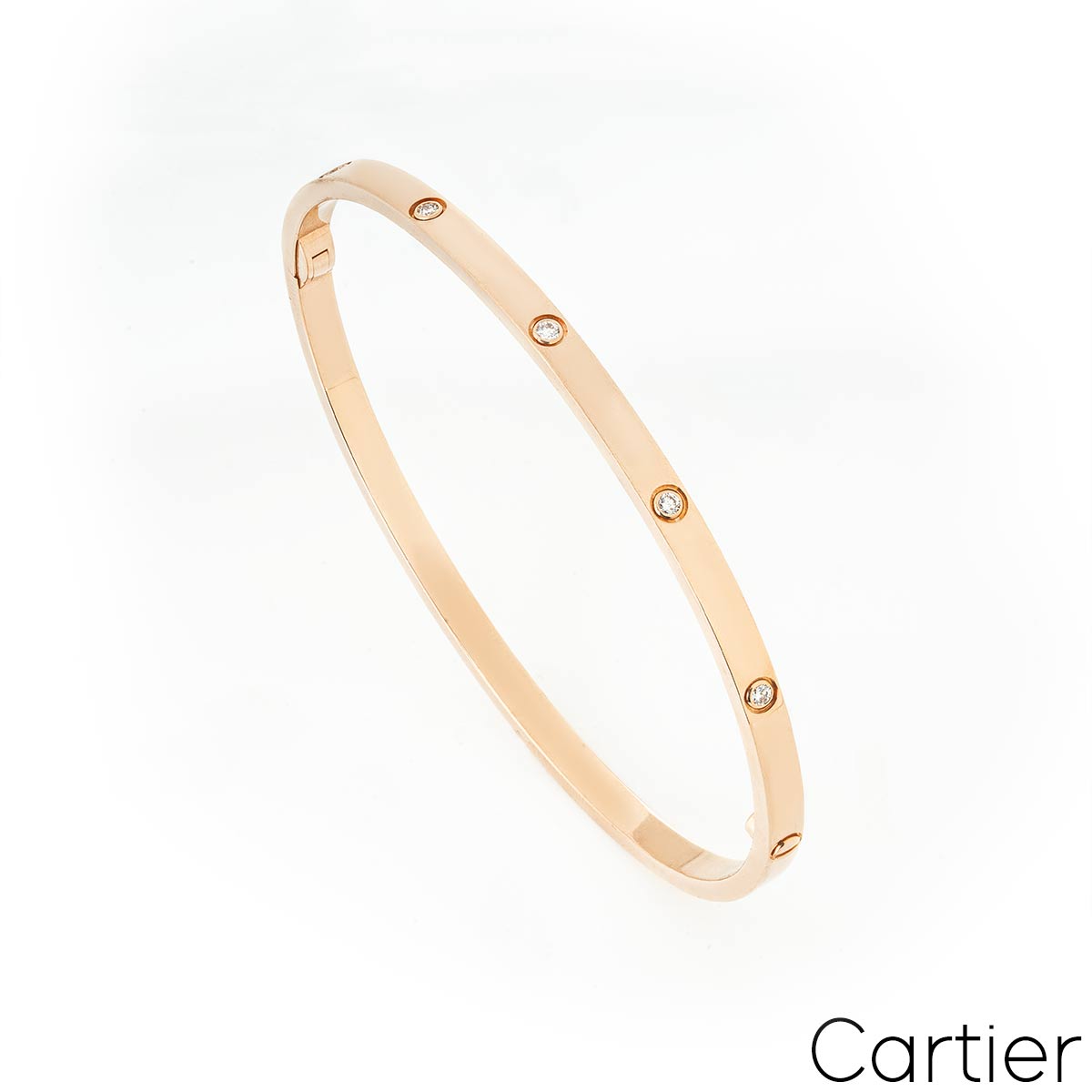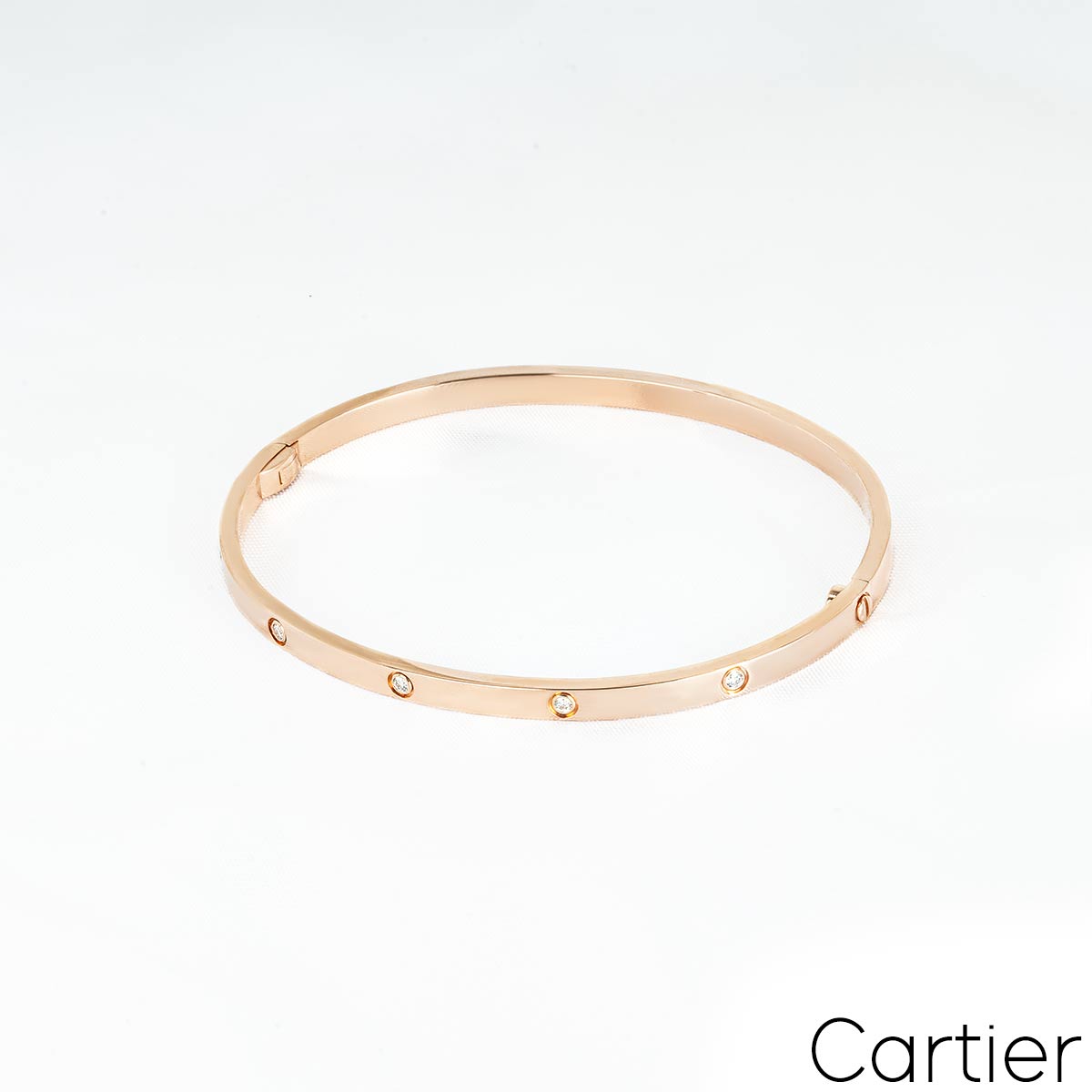 An 18k rose gold Cartier bracelet from the Love collection. The bracelet comprises 10 round brilliant cut diamonds circulating the outer edge with a total weight 0.21ct and features a single screw and hinge fitting. This is the SM version of the love bracelet. The bracelet is a size 17 with a gross weight of 17.40 grams.