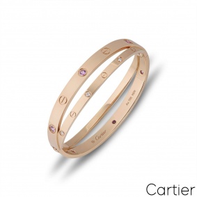 An 18k rose gold half diamond and pink sapphire double Cartier bracelet, from the signature Love collection. Features the iconic Cartier screw motif, alternating with 6 round brilliant cut diamonds and 6 pink sapphires. This bracelet is a size 17, features the service style screw system and has a gross weight of 47 grams.