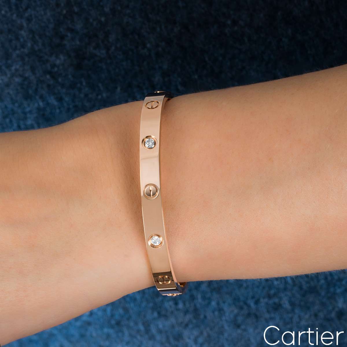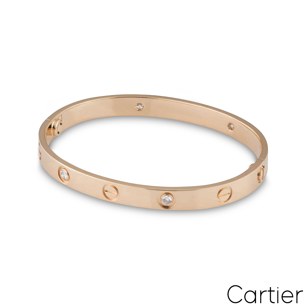 An 18k rose gold Cartier half diamond bracelet from the Love collection. The bracelet comprises of screw motifs alternating with four round brilliant cut diamonds in a rubover setting on the outer edge of the bracelet with a weight of 0.42ct. The bangle is a size 15 and features the new style screw system with a gross weight of 24.8 grams.