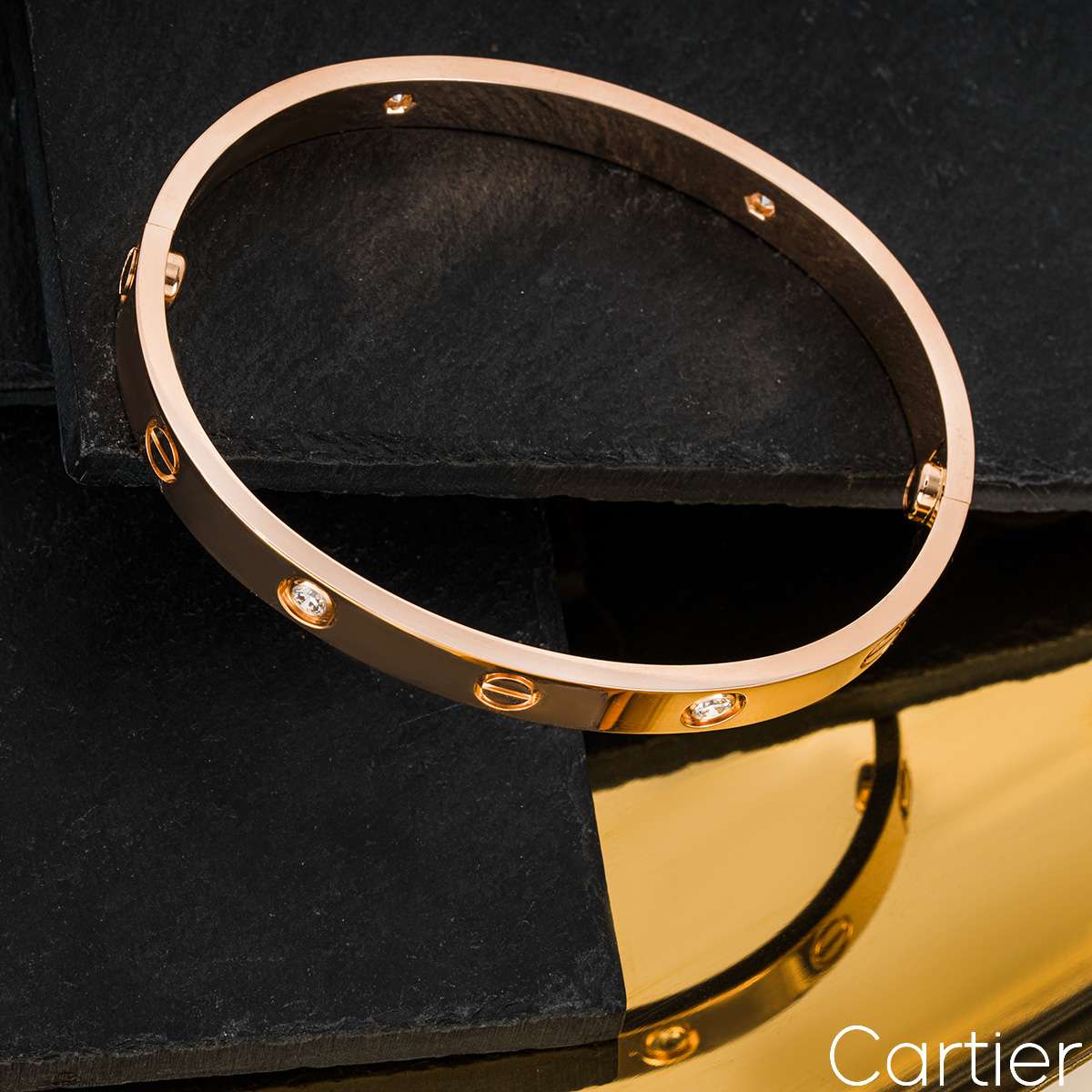 An 18k rose gold Cartier half diamond bracelet from the Love collection. The bracelet comprises of screw motifs alternating with four round brilliant cut diamonds in a rubover setting on the outer edge of the bracelet with a weight of 0.42ct. The bangle is a size 16 and features the new style screw system with a gross weight of 28.8 grams.