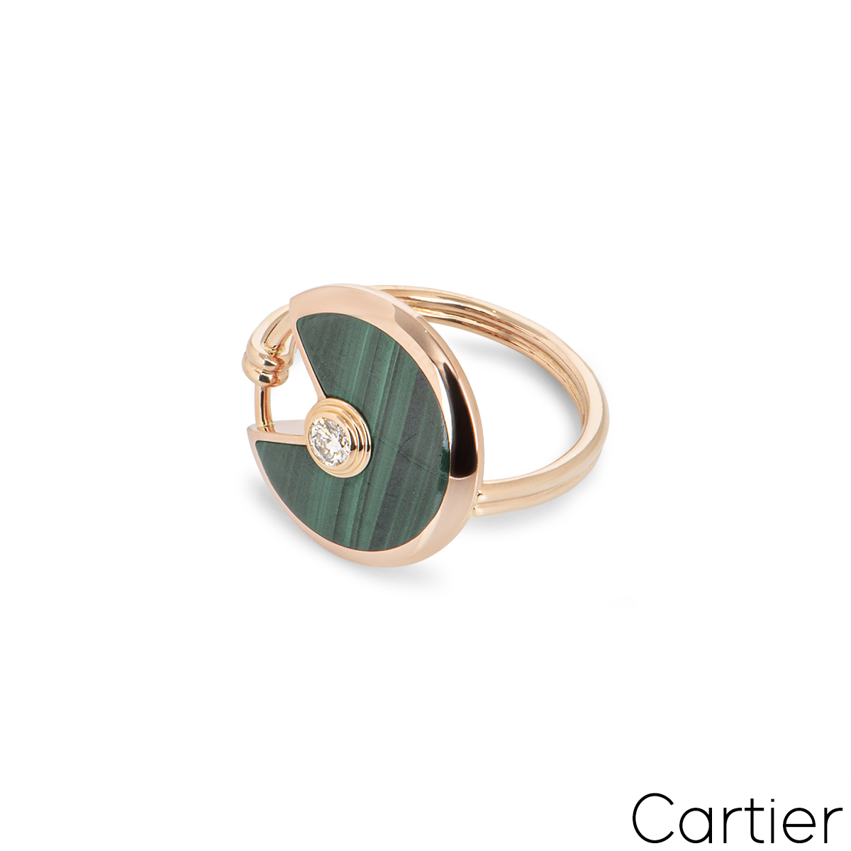 An 18k rose gold Cartier ring from the Amulette de Cartier collection. The ring comprises of a circular talisman, set with malachite and complemented by a single 0.09ct round brilliant cut diamond, in a rub over setting. The ring is a size M and has a gross weight of 6.02 grams.