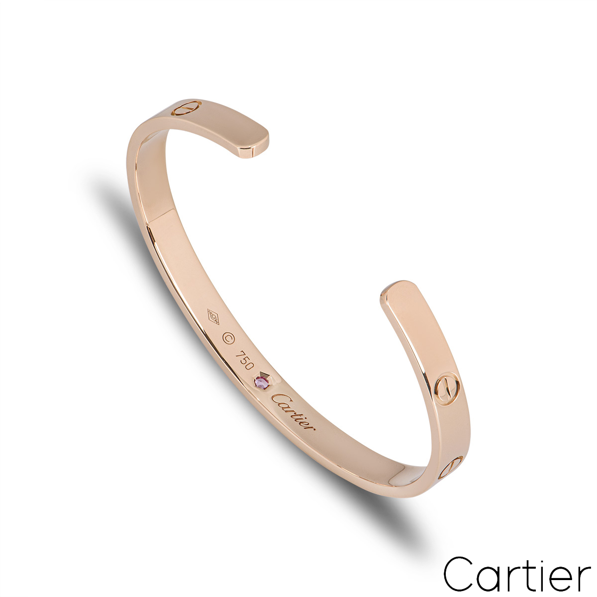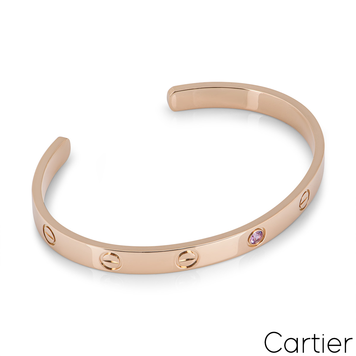 An 18k rose gold cuff bracelet by Cartier from the Love collection. This cuff bracelet has the iconic screw motif displayed throughout the outer edge with a single pink sapphire in the centre. The bracelet is a size 19 and has a gross weight of 26.50 grams.