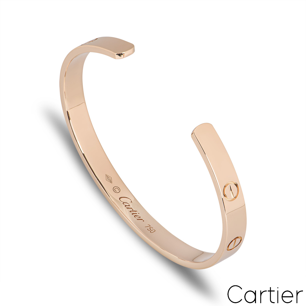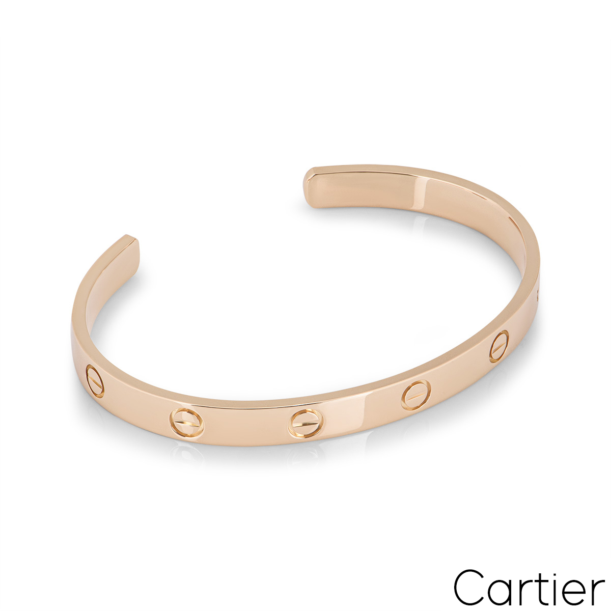 An iconic 18k rose gold Cartier bracelet from the Love collection. The bracelet comes in a cuff style and features the traditional screw motif design which is displayed around the outer edge of the bracelet. The bracelet is a size 18 and has a gross weight of 24.4 grams.
