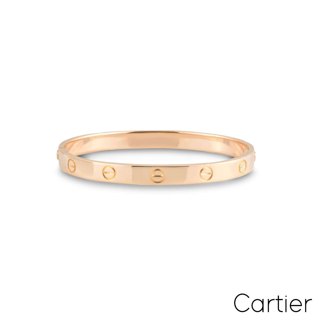 A signature 18k rose gold Cartier plain bracelet from the Love collection. The bracelet has the iconic screw motif displayed around the outer side of the bangle and has the new style screw fitting. The bracelet is a size 18 and has a gross weight of 34.0 grams.