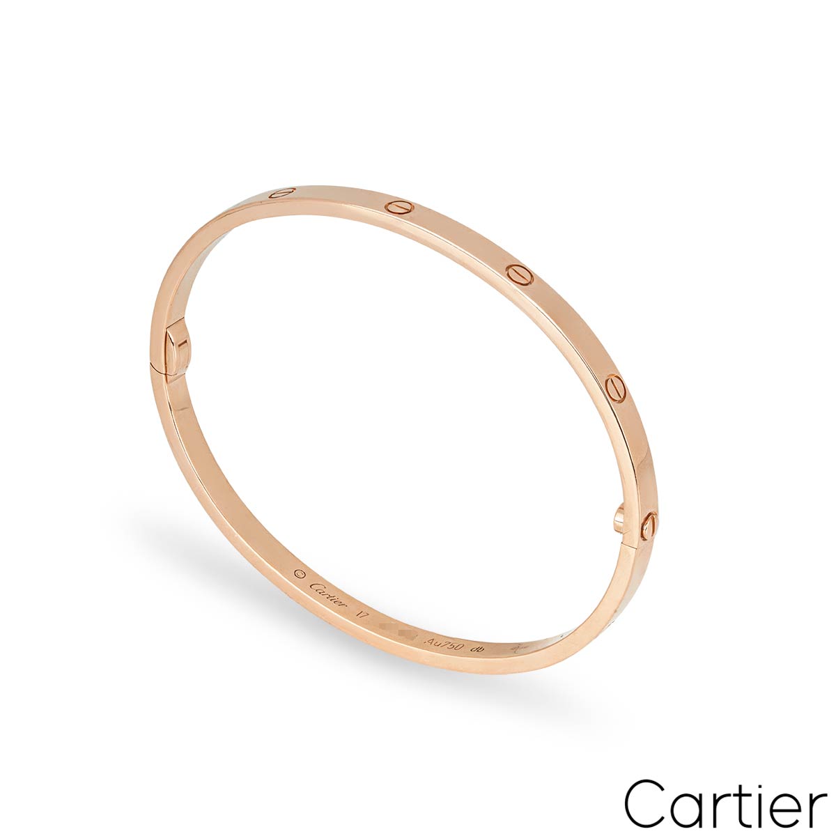 A Cartier bracelet in 18k rose gold, from their iconic Love collection. This smaller model (SM) of the classic Love bracelet features the Cartier screw motif design and a single screw and hinge fitting. The bracelet is a size 18 and has a gross weight of 19.40 grams.