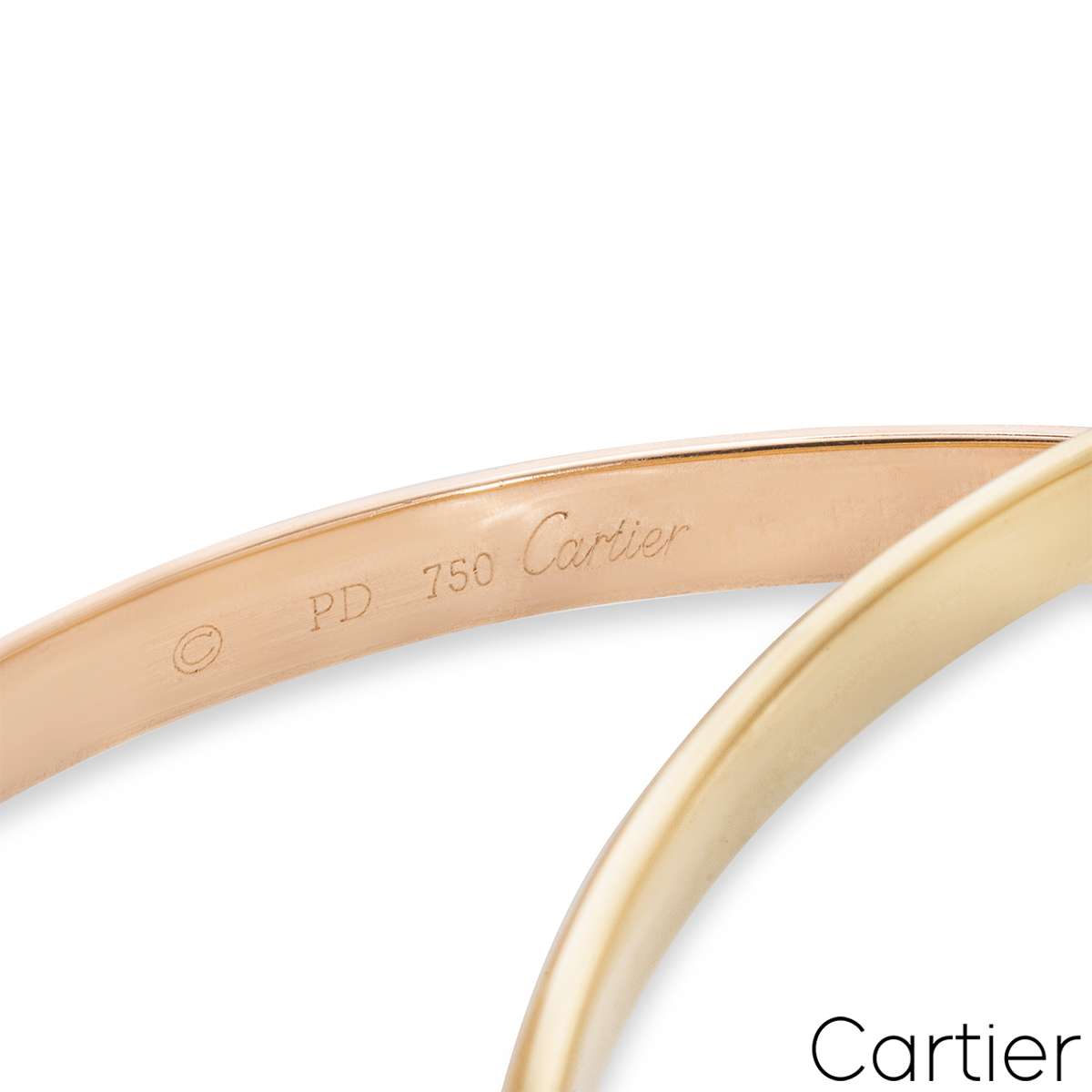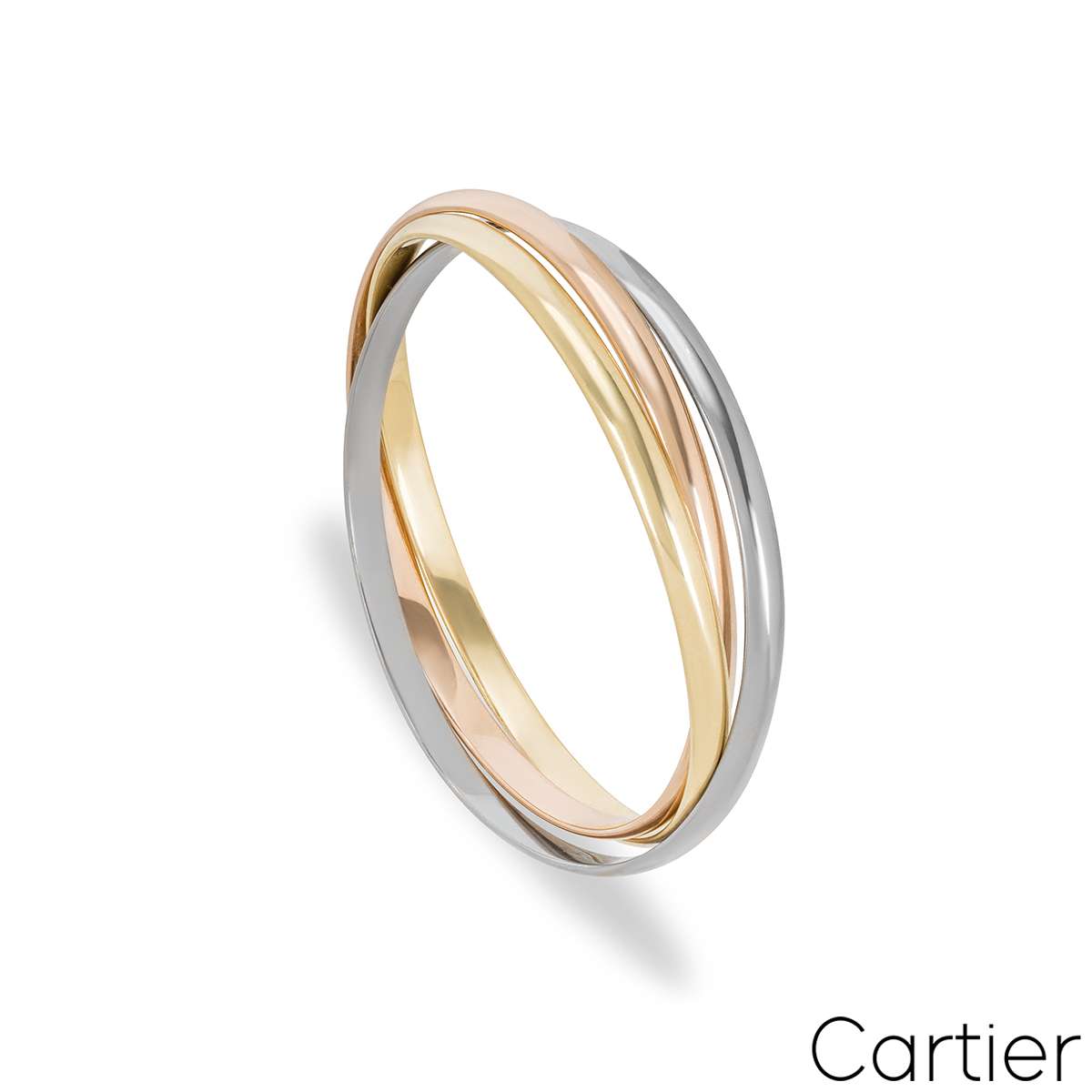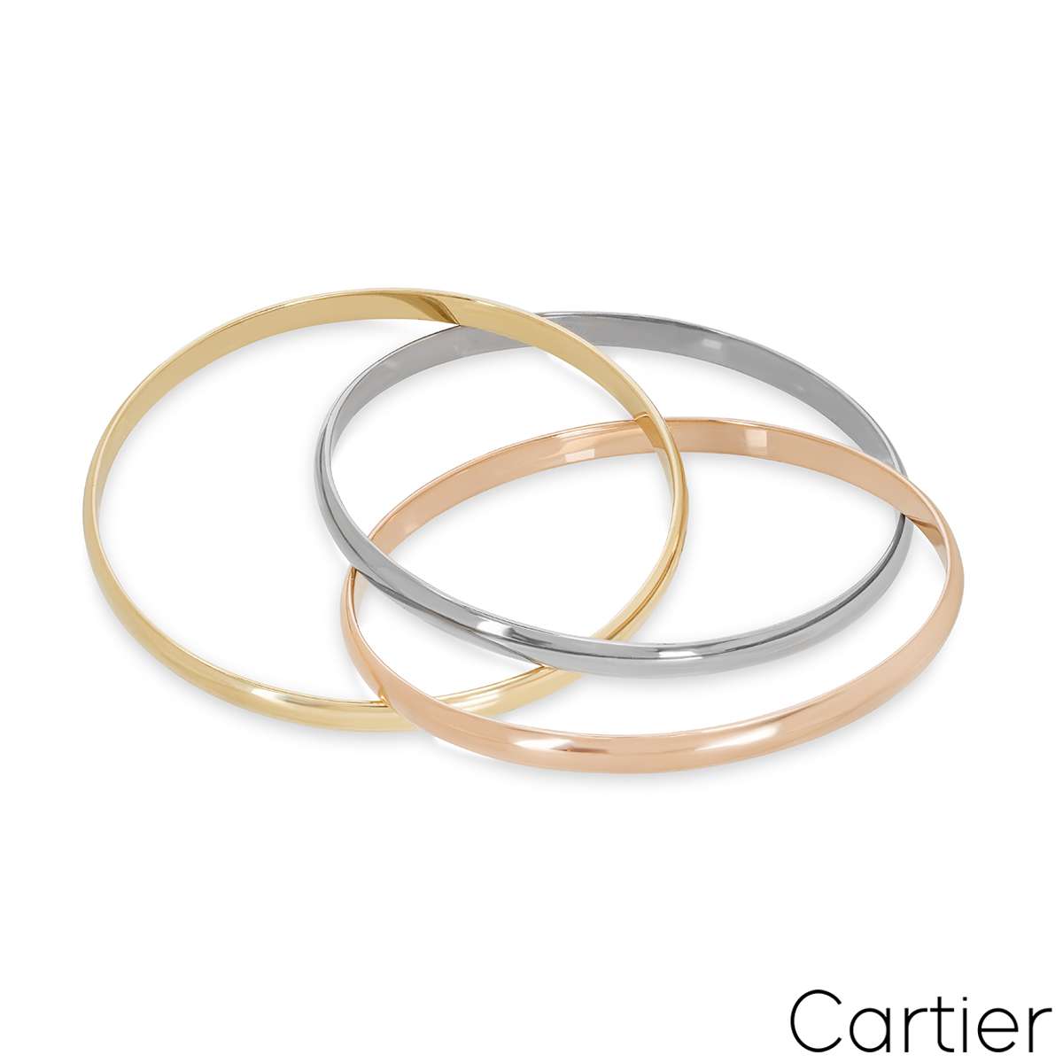 An iconic 18k tri-colour Cartier bracelet from the Trinity De Cartier collection. The bracelet is made up of three intertwined white, rose and yellow gold 4.4mm bands. The bracelet is a size 20 and fits a wrist size of 17cm - 17.9cm, and has a gross weight of 61.7 grams.