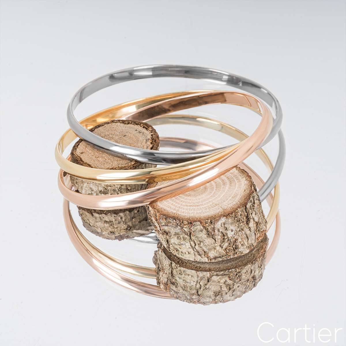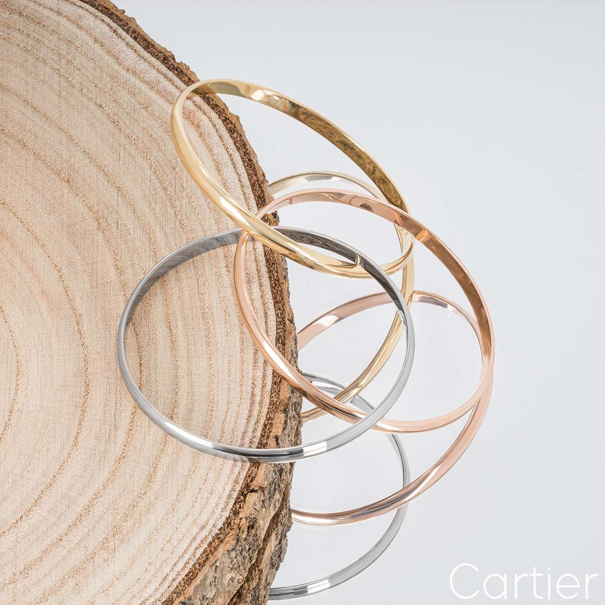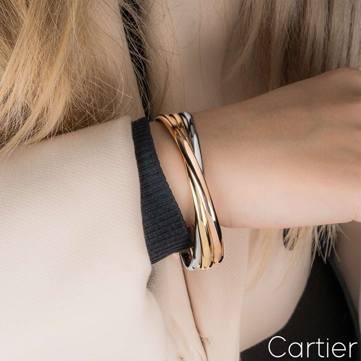An iconic 18k tri-colour Cartier bracelet from the Trinity De Cartier collection. The bracelet is made up of three intertwined white, rose and yellow gold 4.4mm bands. The bracelet is a size 20 and fits a wrist size of 17cm - 17.9cm, and has a gross weight of 61.7 grams.