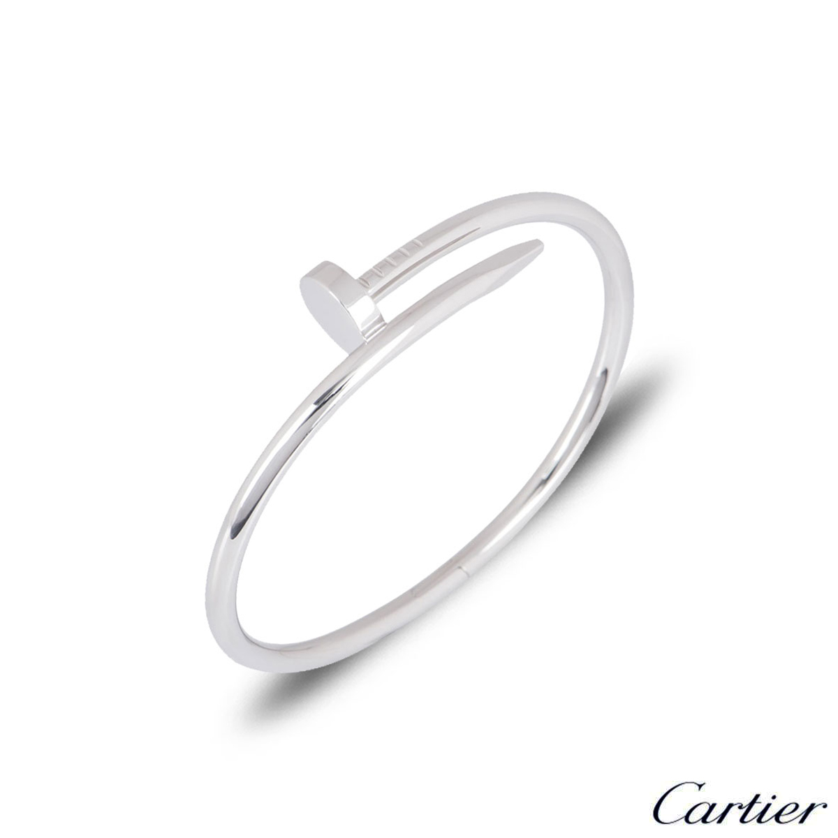 An unworn 18k white gold Cartier bracelet from the Juste Un Clou collection. The bracelet is wrapped around with a nail head at one end and nail end at the other tip. The bracelet is size 17 with the new style clasp fitting and has a gross weight of 34.50 grams.