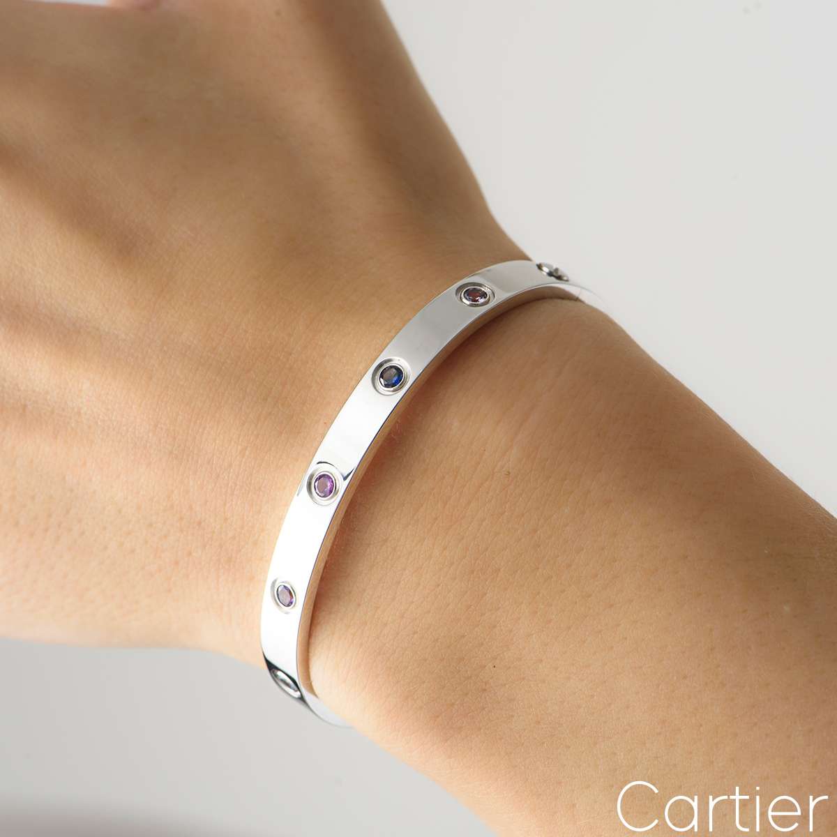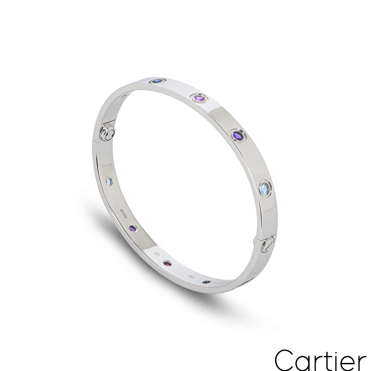 An 18k white gold coloured stones Cartier bracelet from the Love collection. The bracelet is set with 10 coloured stones throughout the centre, including purple spinel, blue and pink sapphires, amethyst and aquamarine. The bangle has the new style screw system and is a size 18, with a gross weight of 31.20 grams.