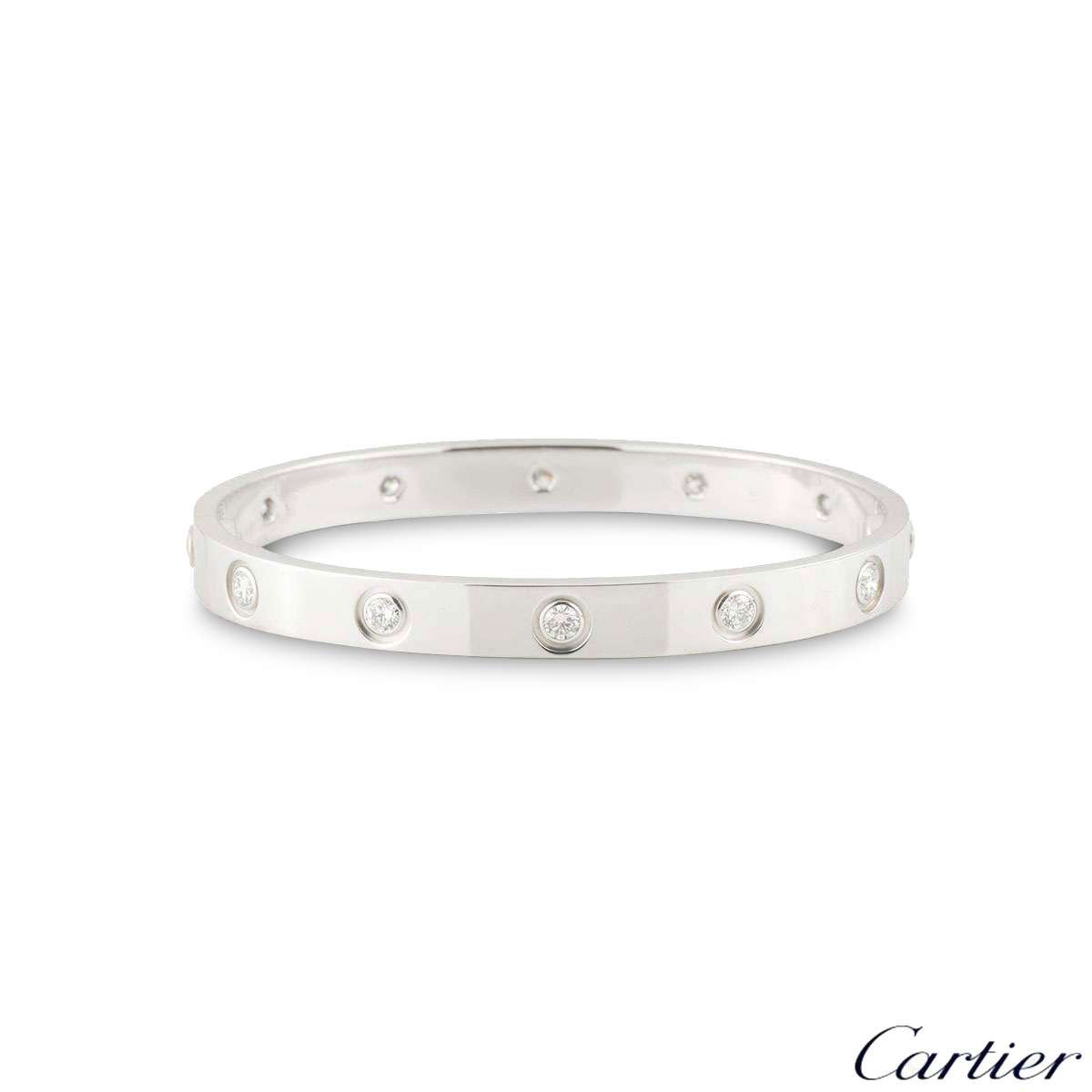 An iconic 18k white gold full diamond Cartier bracelet from the Love collection. The bracelet is set with 10 round brilliant cut diamonds circulating the outer edge throughout in a rubover setting. The bracelet is size 17 and features the new style screw fitting with a gross weight of 30.4 grams.