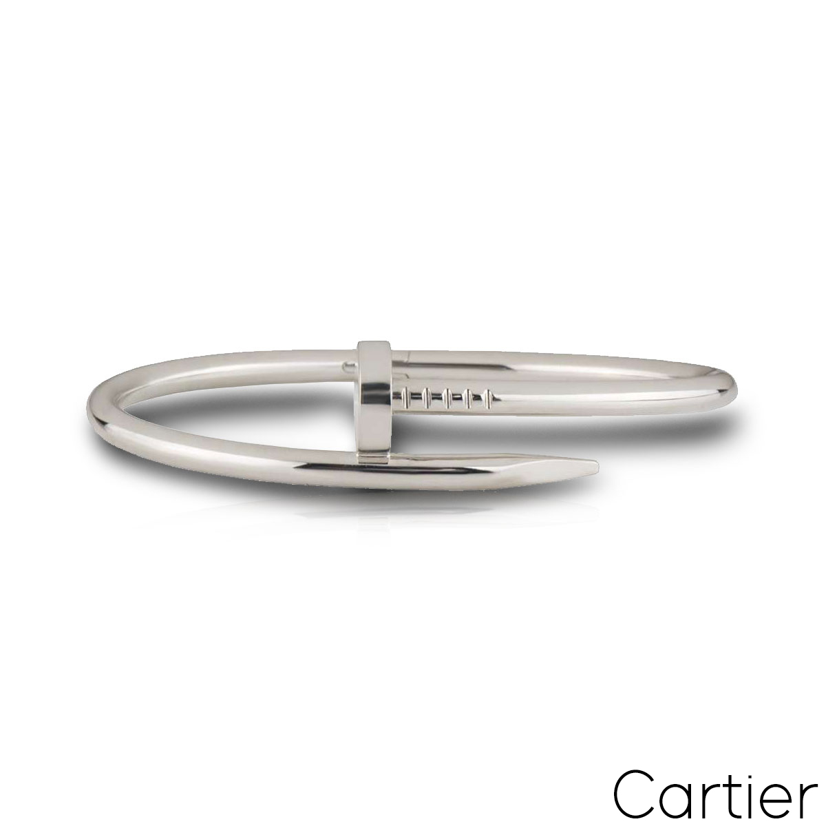 An iconic 18k white gold Cartier bracelet from the Juste Un Clou collection. The bracelet is wrapped around with a nail head at one end and nail end at the other tip. The bracelet is size 18 with the old style clasp fitting and has a gross weight of 35.00 grams.