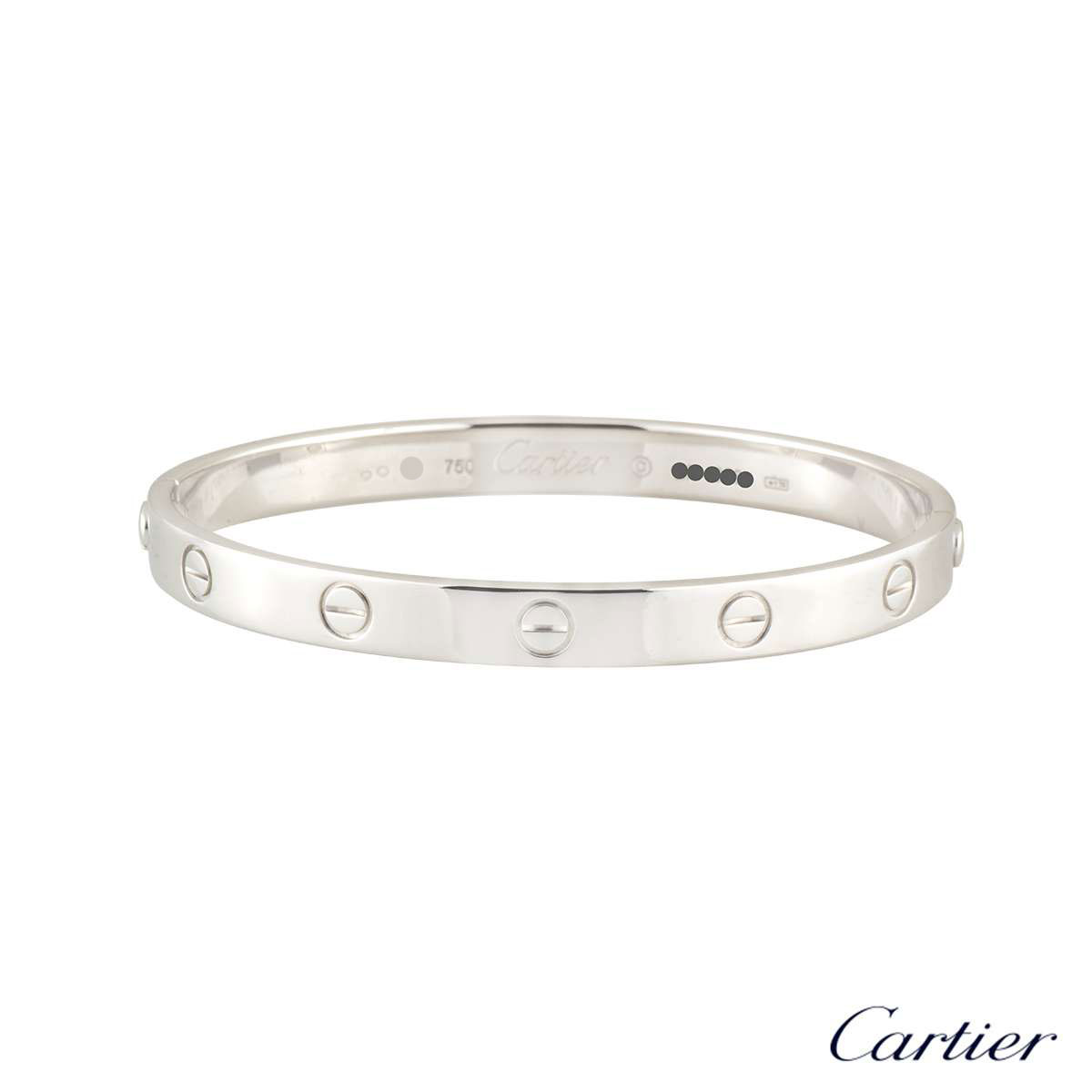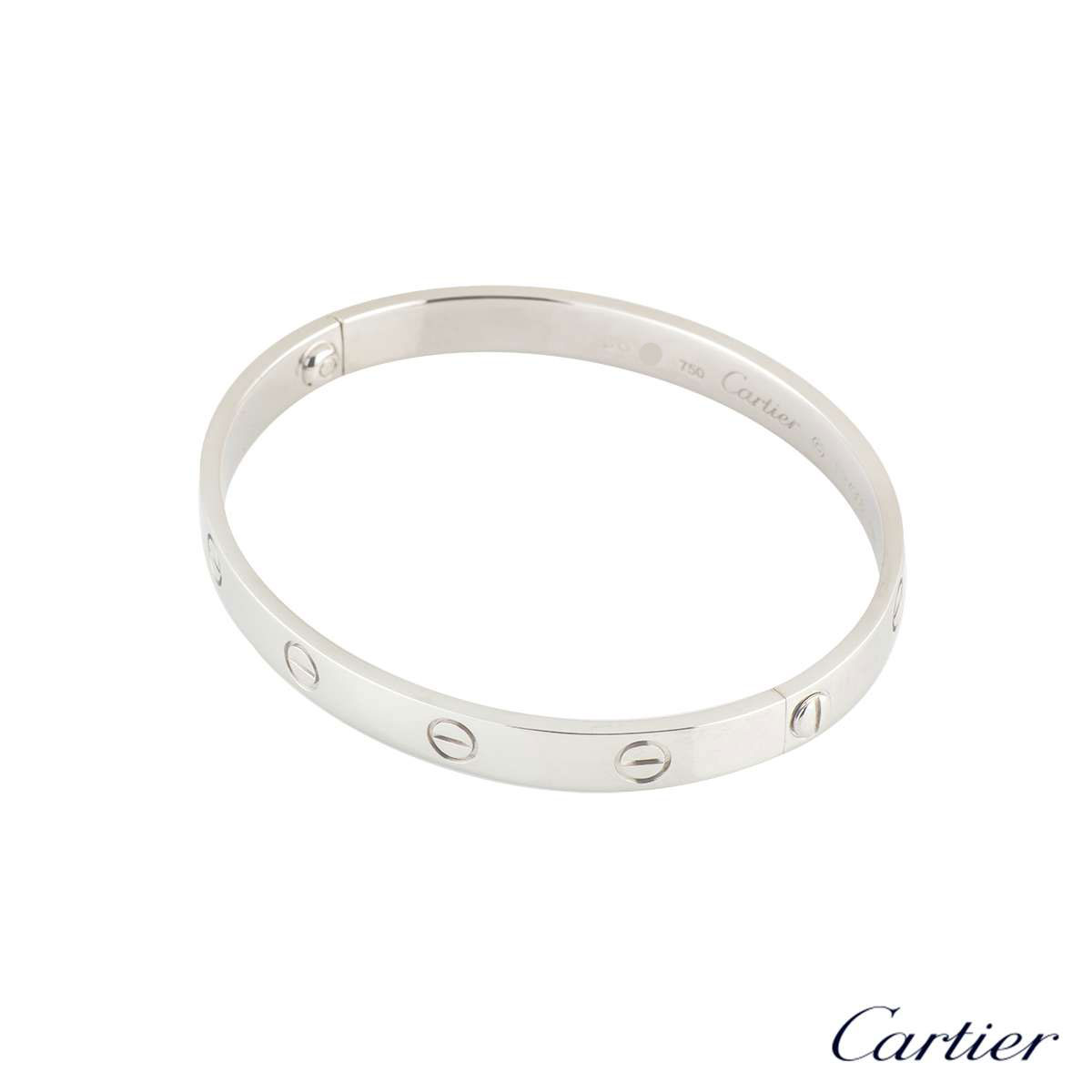 A signature 18k white gold Cartier bracelet from the Love collection. The bracelet has the iconic screw motif displayed around the outer edge of the bracelet and features the old screw fitting. The bracelet is size 20 and has a gross weight of 36.60 grams.