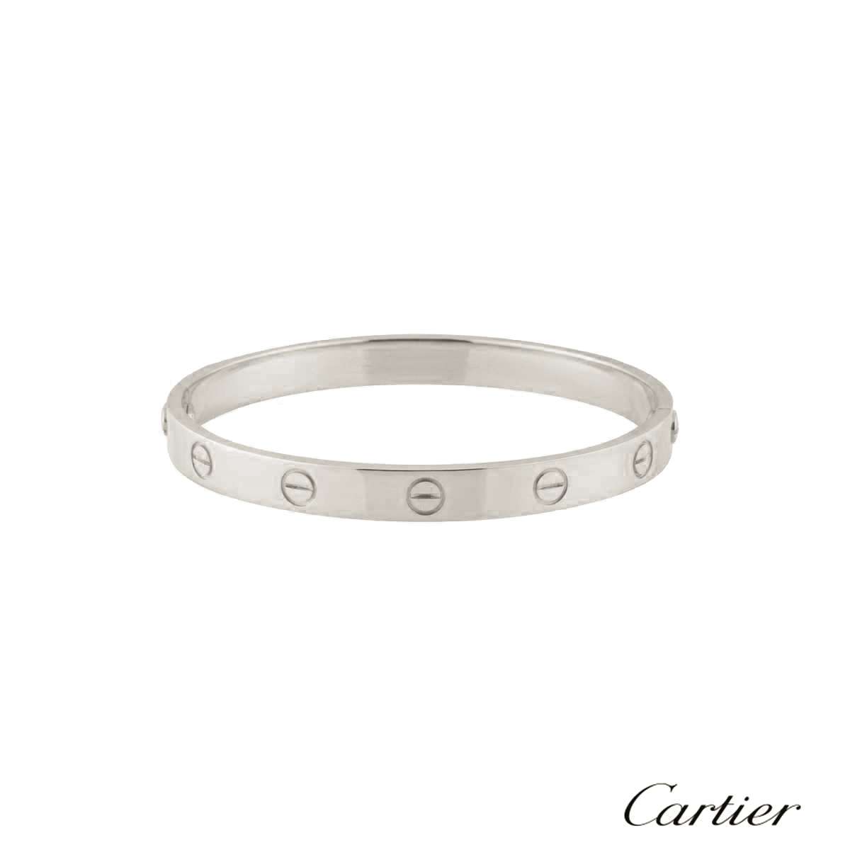 An iconic 18k white gold bracelet by Cartier from the Love collection. The bracelet has the iconic screw motif displayed around the outer edge of the bracelet and features the old style screw fitting. The bracelet is size 20 and has a gross weight of 37.37 grams.