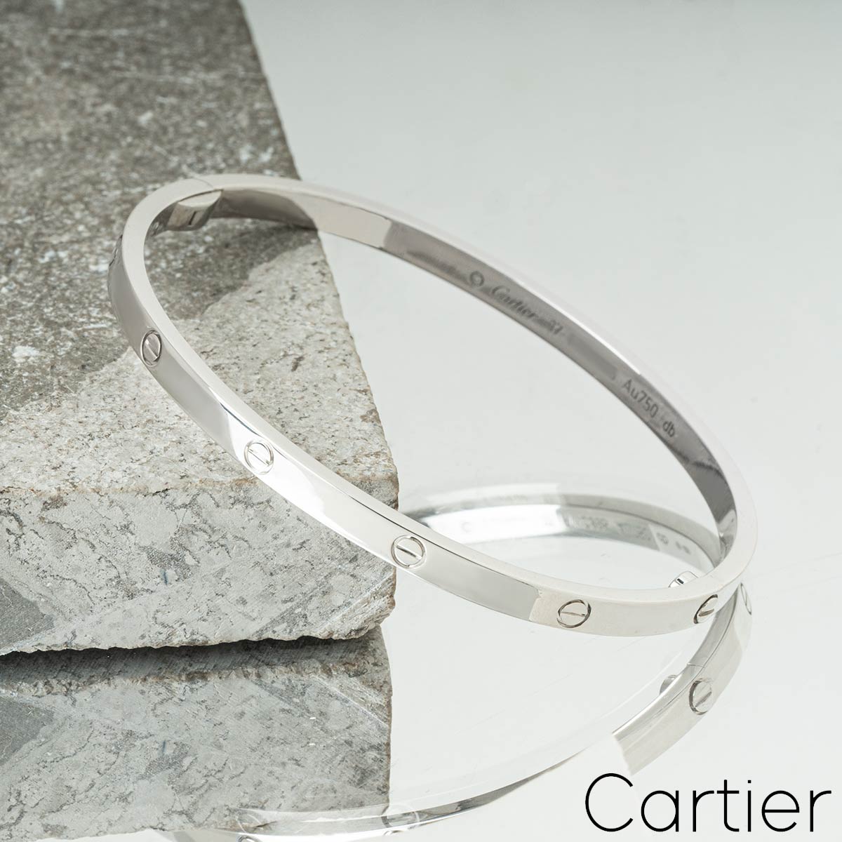 A timeless 18k white gold Cartier bracelet from the Love collection. The bracelet comprises of the iconic screw motif displayed around the outer edge and features a single screw and hinge fitting. This is the SM version of the love bracelet in a size 16 with a gross weight of 18.20 grams.