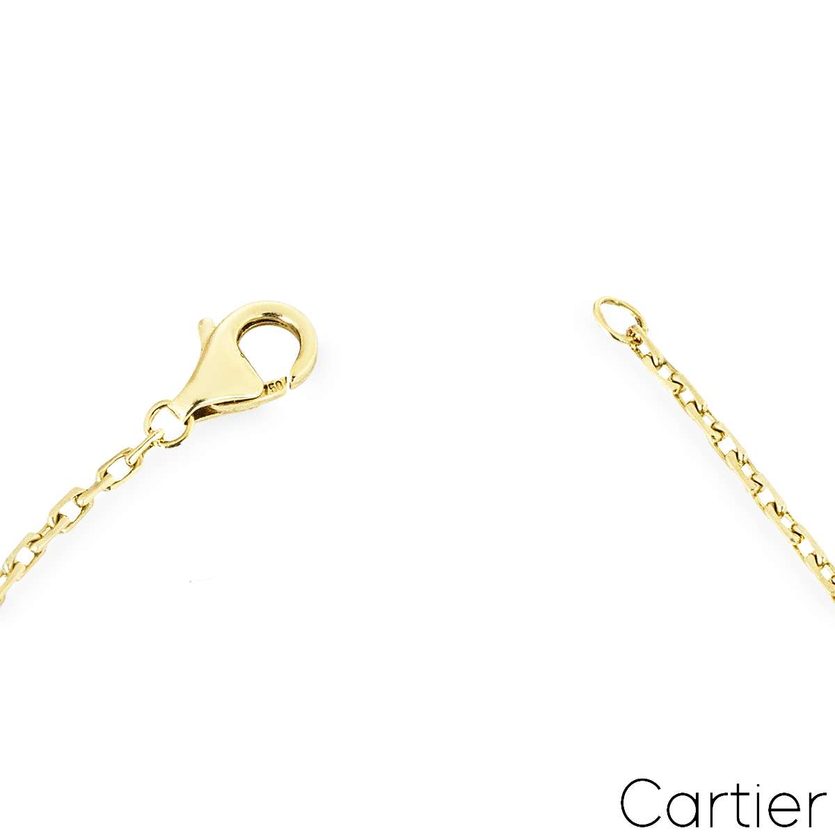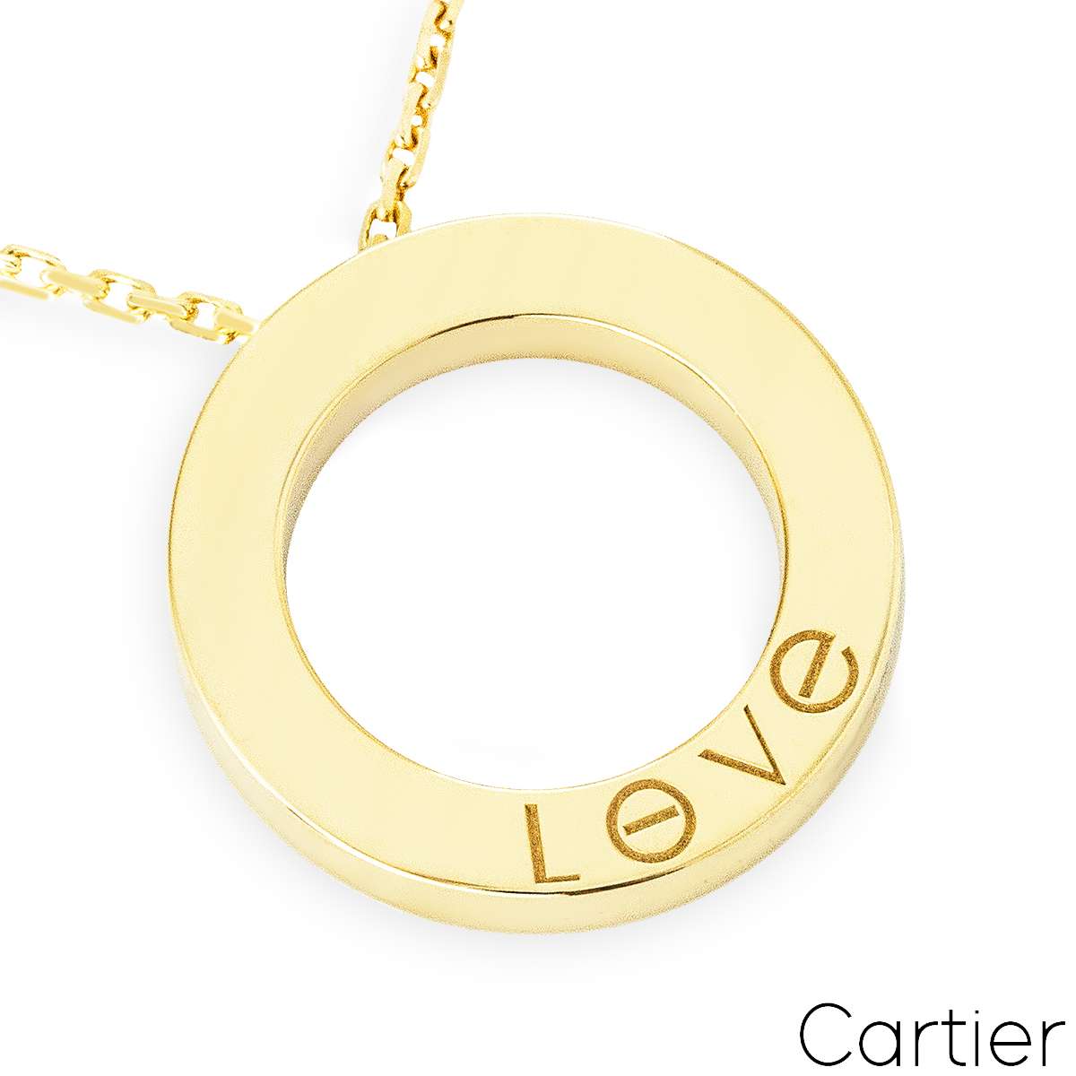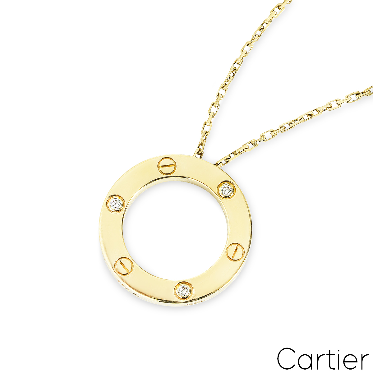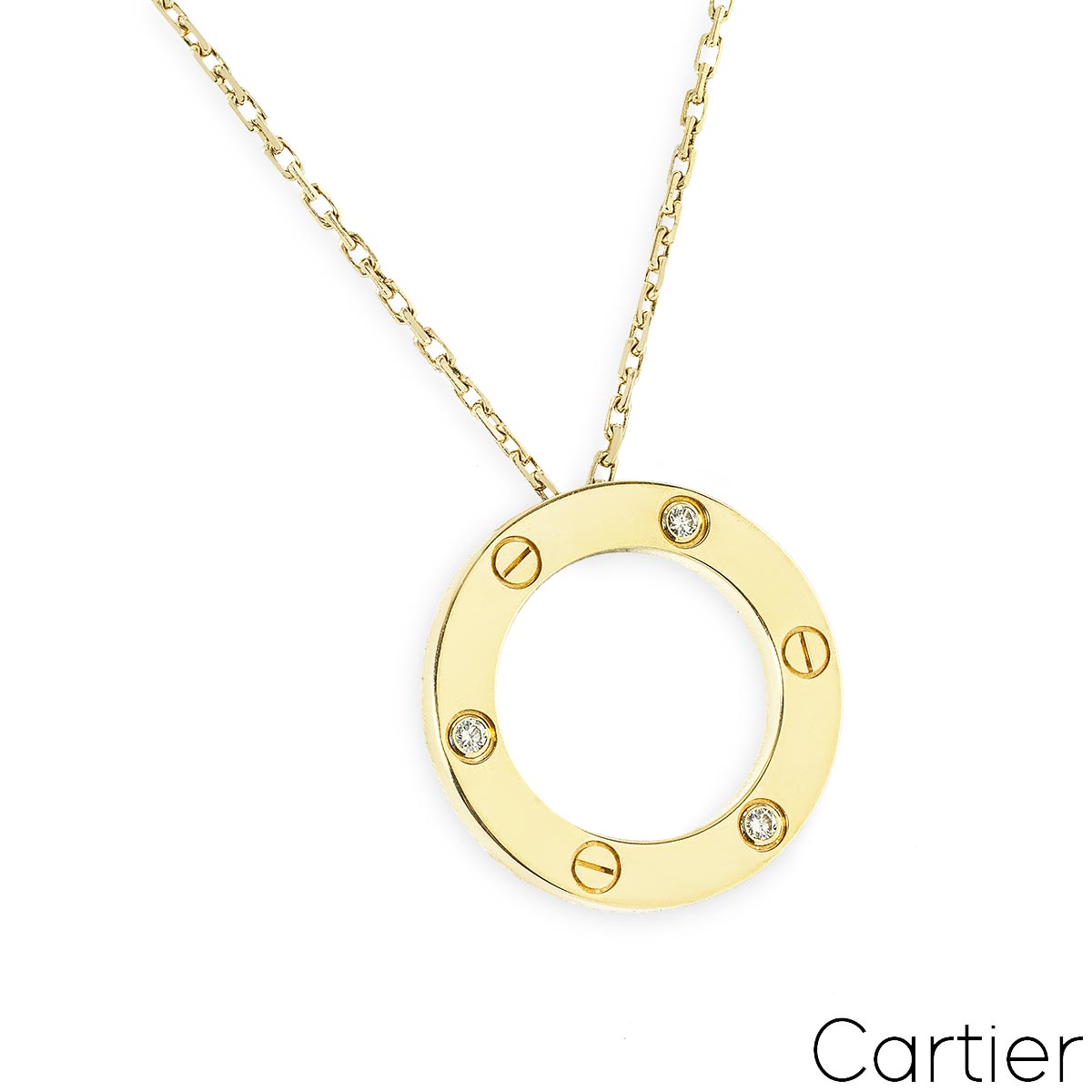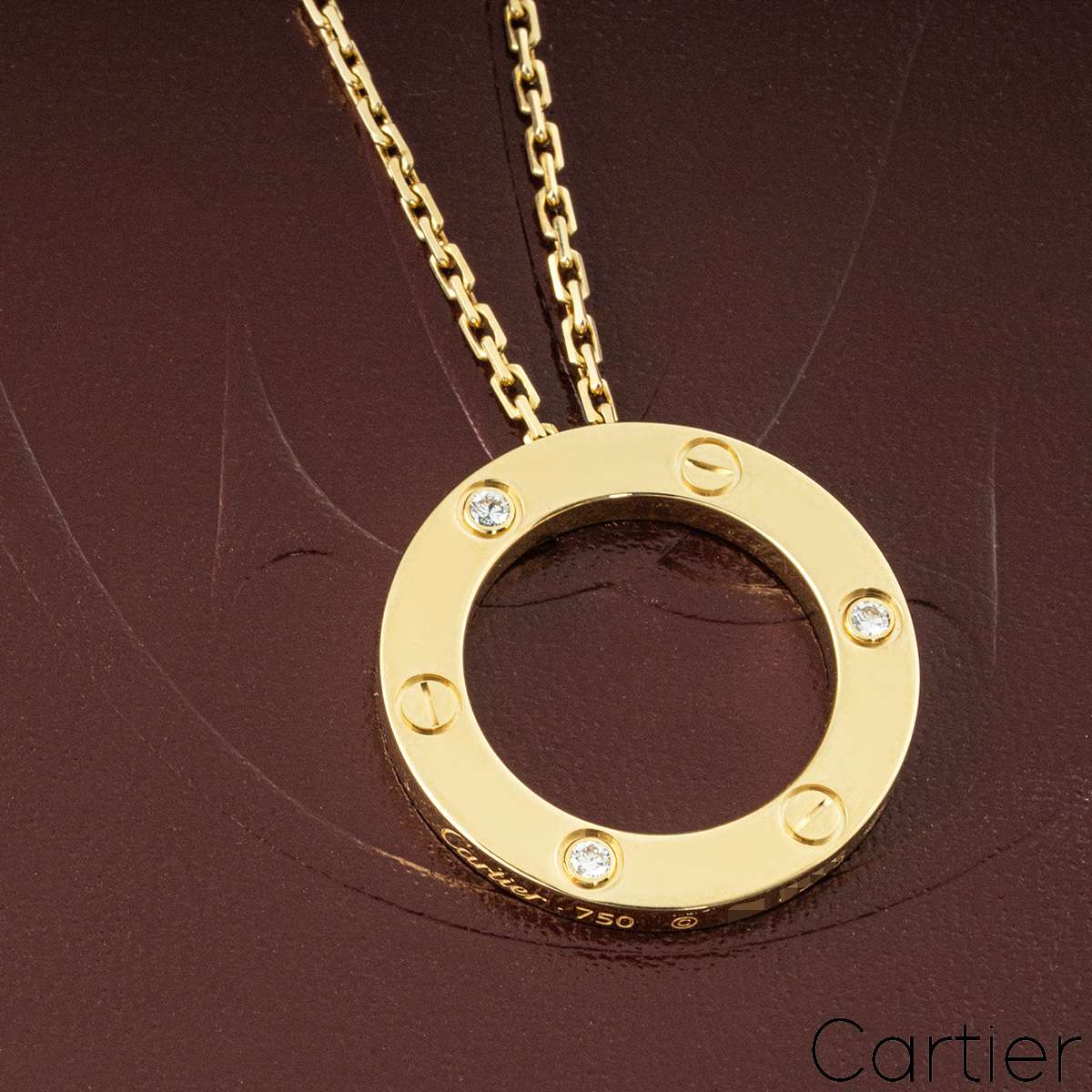 An 18k yellow gold diamond pendant by Cartier from the Love collection. The pendant is comprises of an open circular motif, set with 3 round brilliant cut diamonds totalling 0.07ct and alternating between the iconic screws. On the reverse of the pendant the word 'LOVE' is engraved. The pendant measures 2.4cm in diameter, is suspended from a 16-inch chain that finishes with a lobster clasp and has a gross weight of 12.7 grams.