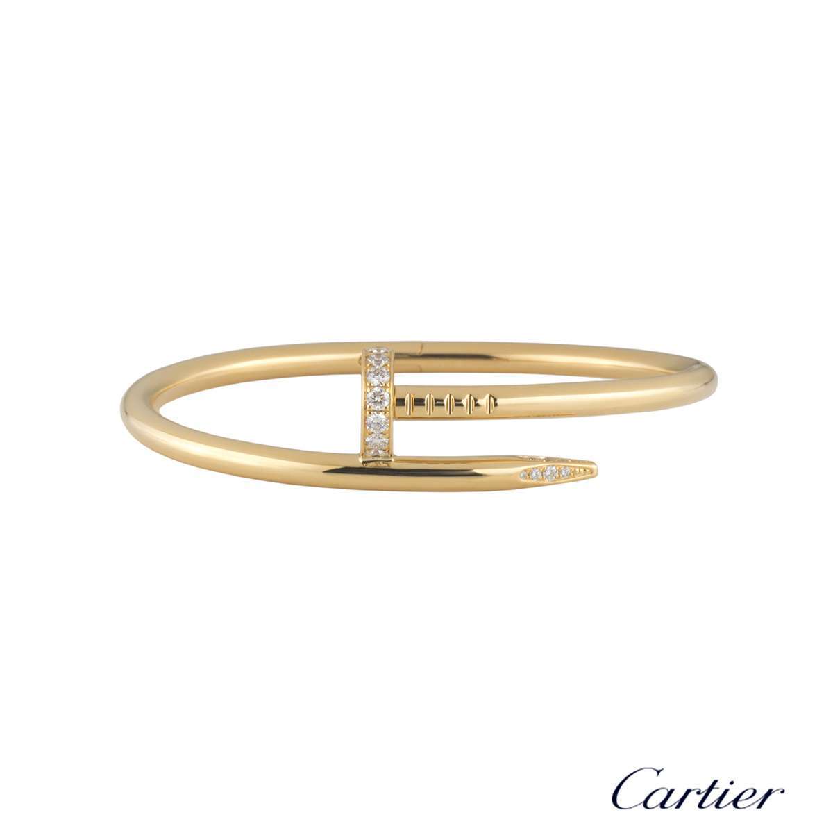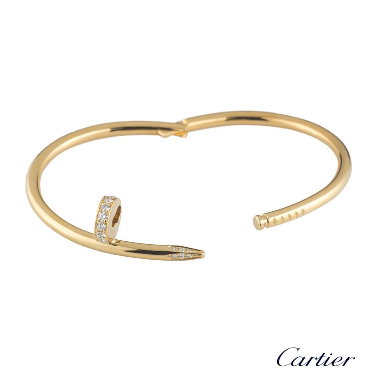 An iconic 18k yellow gold Cartier diamond bracelet from the Juste Un Clou collection. The bracelet is in the style of a nail and has 27 round brilliant cut pave diamonds set in the head and tip, totalling 0.54ct. The diamonds are predominantly F colour and VS clarity. The bracelet is size 15 and features the old style clasp with a gross weight of 30.1 grams.