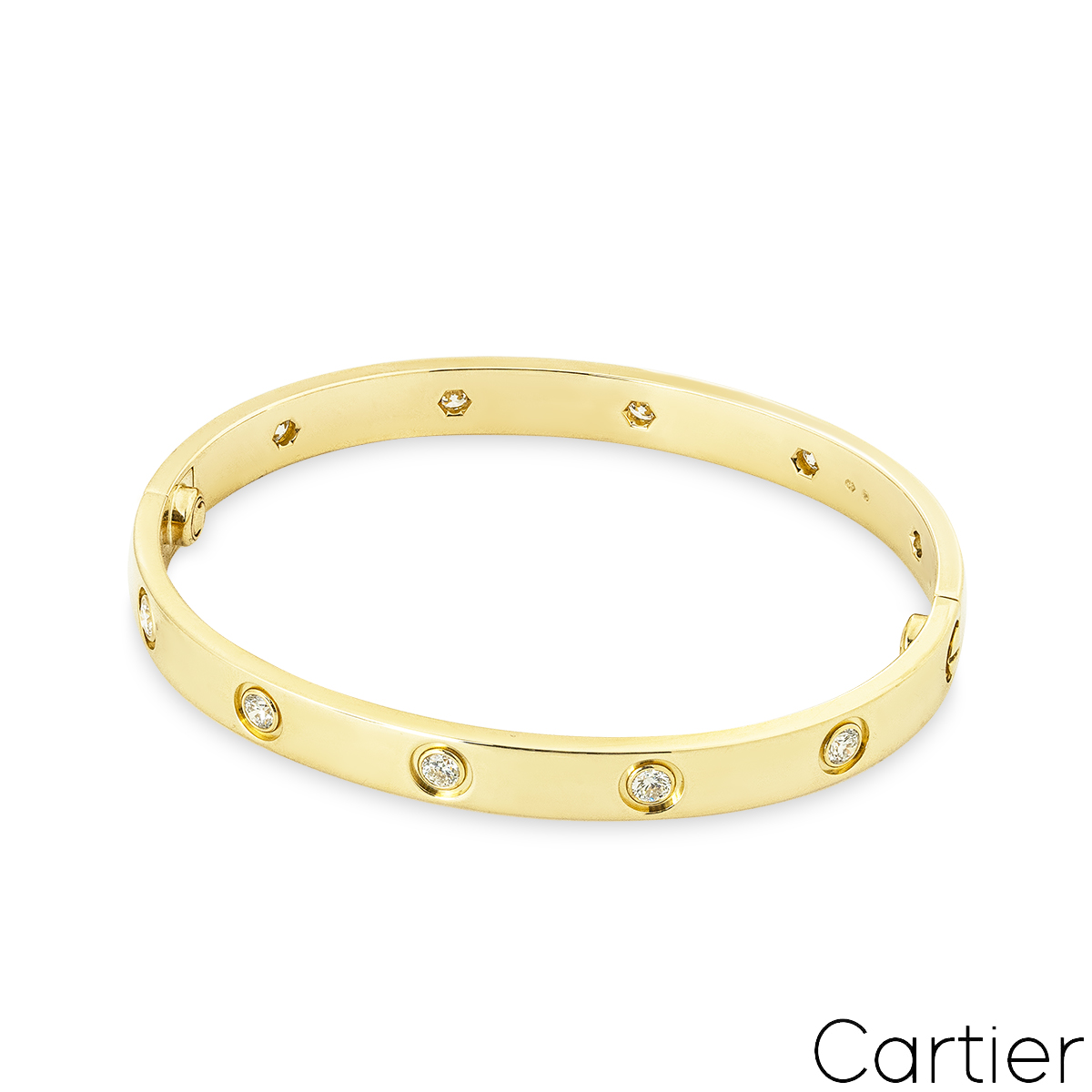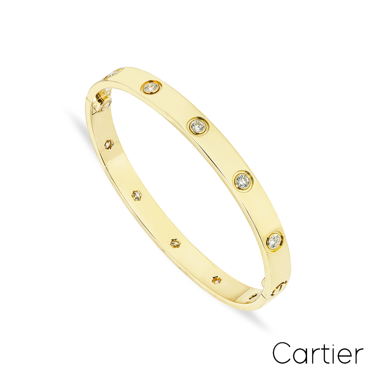 An iconic 18k yellow gold full diamond bracelet by Cartier from the Love collection. The bracelet is set with 10 round brilliant cut diamonds in a bezel setting surrounding the outer edge, totalling 0.96ct. The bracelet is a size 17 and features the service replacement screw system and has a gross weight of 31.4 grams.