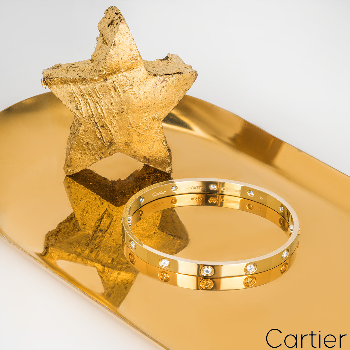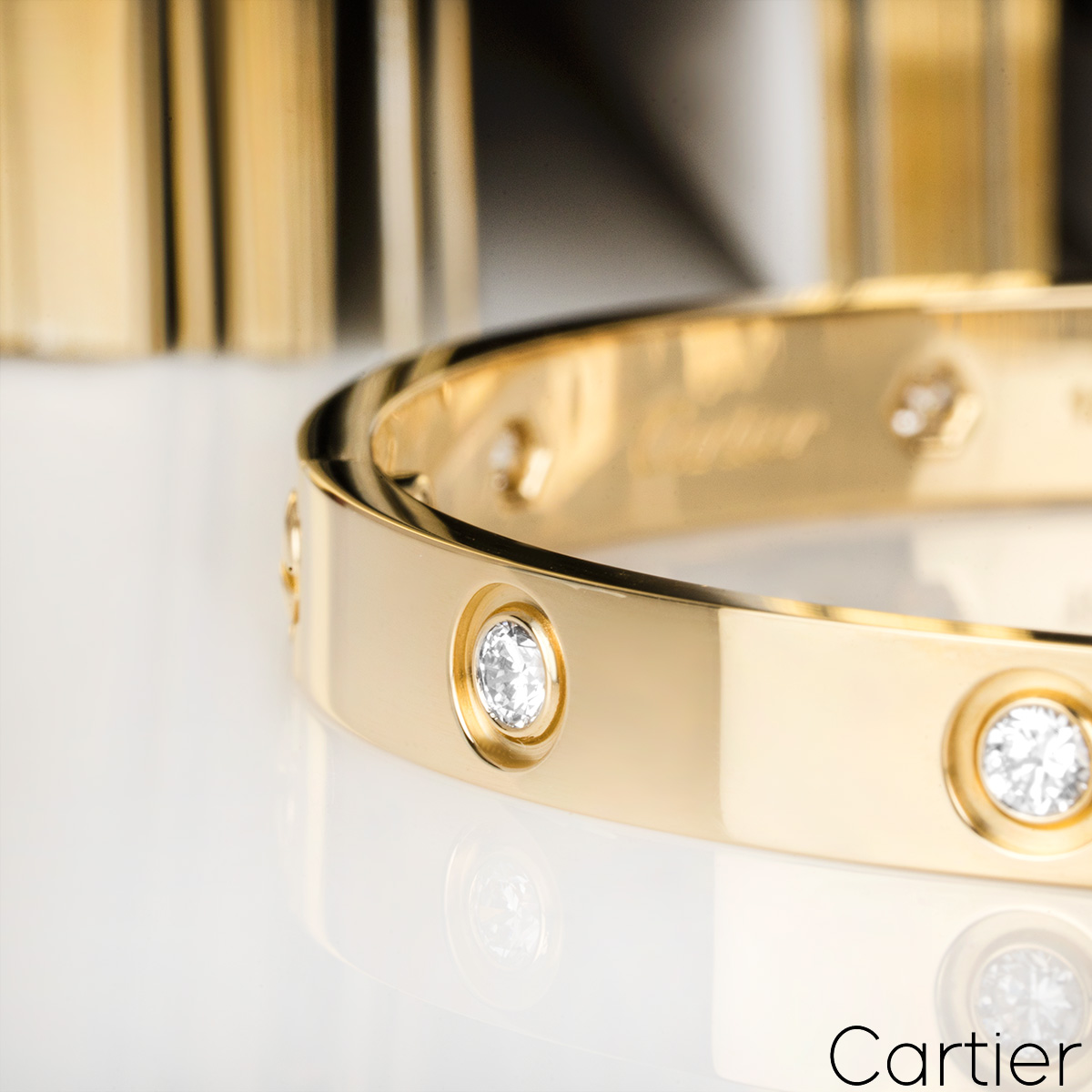 An iconic 18k yellow gold full diamond bracelet by Cartier from the Love collection. The bracelet is set with 10 round brilliant cut diamonds in a rubover setting circulating the outer edge throughout totalling 0.96ct. The bracelet is a size 17 and features the old style screw fitting and has a gross weight of 30.20 grams.