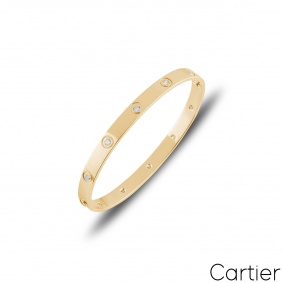 An 18k yellow old half diamond Cartier bracelet from the Love collection. The iconic screw motif alternates with 4 round brilliant cut diamonds throughout the centre of the bangle. The bangle is a size 16 and features the old style screw system with a gross weight of 28.40 grams.