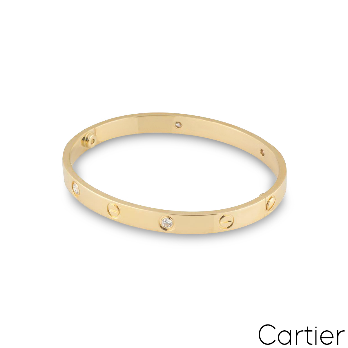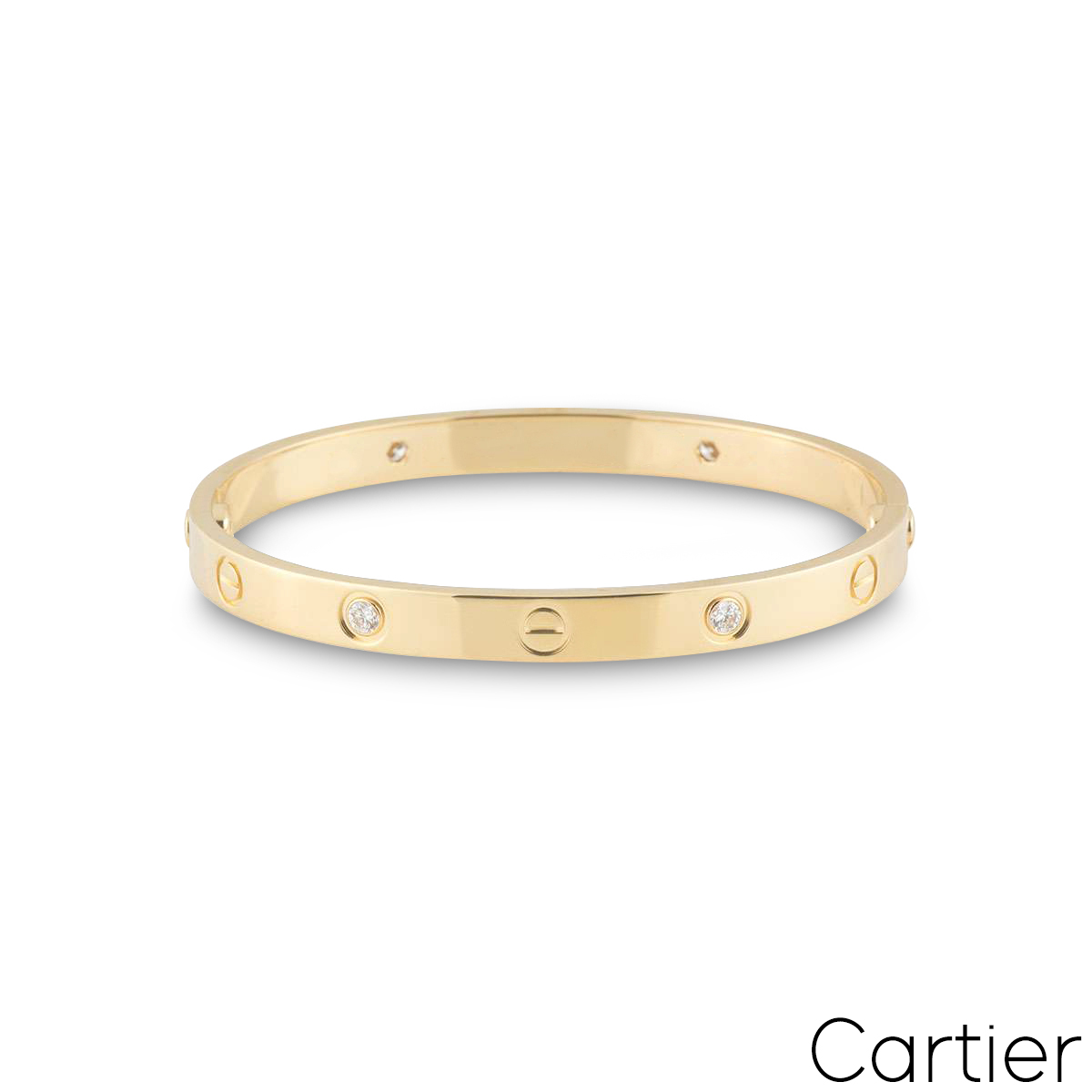 An 18k yellow gold Cartier half diamond bracelet from the Love collection. The bracelet comprises of screw motifs alternating with four round brilliant cut diamonds in a rubover setting on the outer edge of the bracelet with a weight of 0.42ct. The bracelet is a size 16 and features the old style screw system with a gross weight of 33.00 grams.