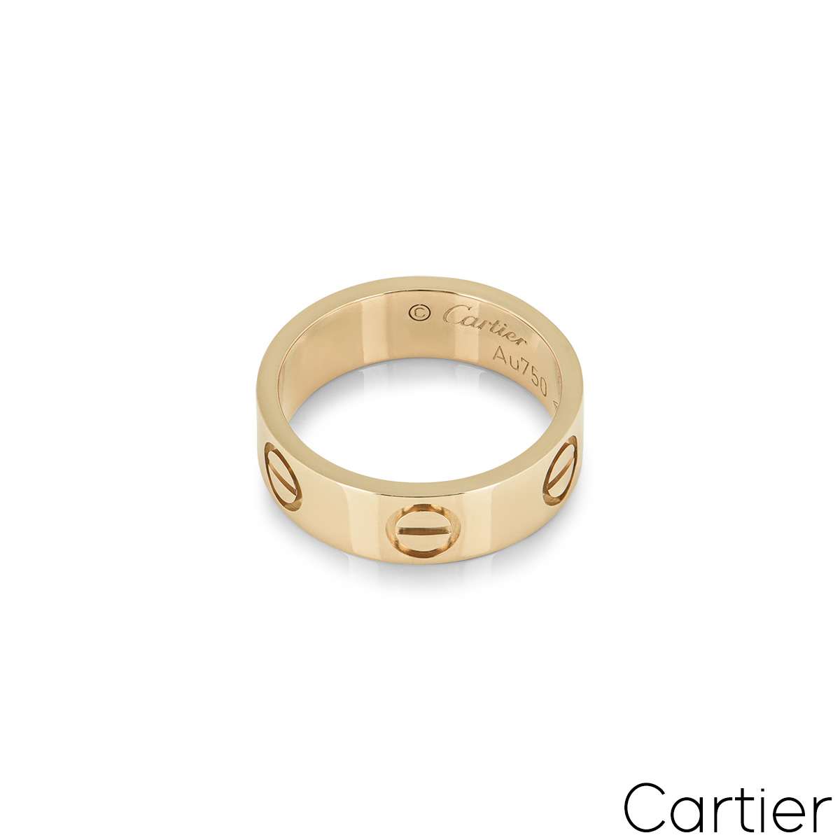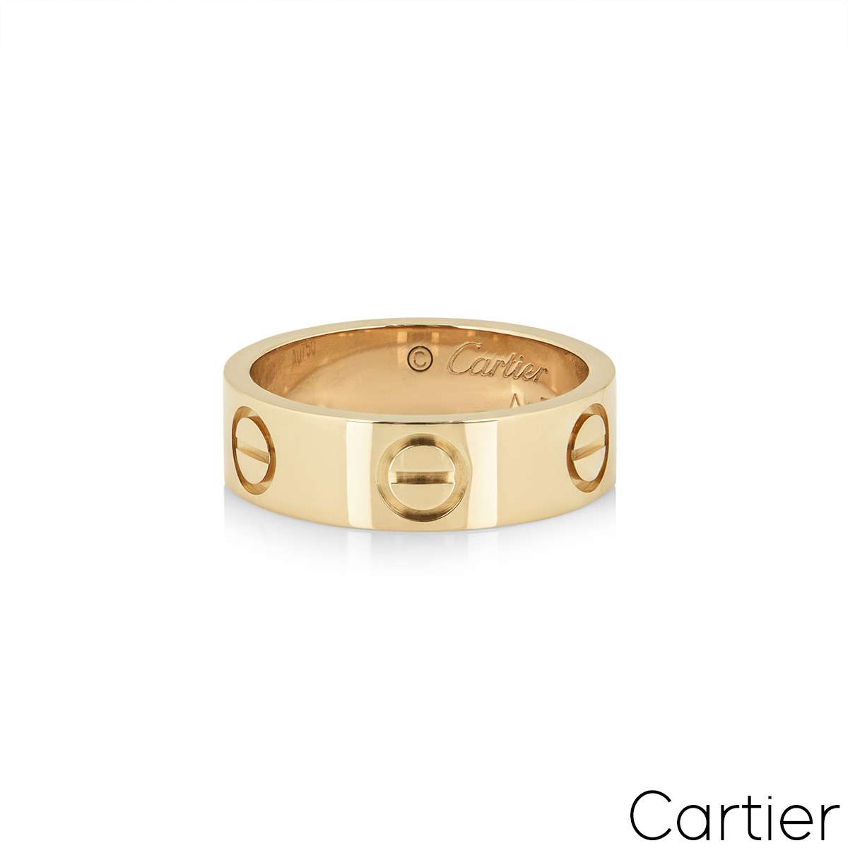 An 18k yellow gold ring from the Cartier Love collection. The ring features the iconic screw motif throughout the centre of the band. The 5.5mm wide ring is a size 67 and has a gross weight of 7.30 grams.