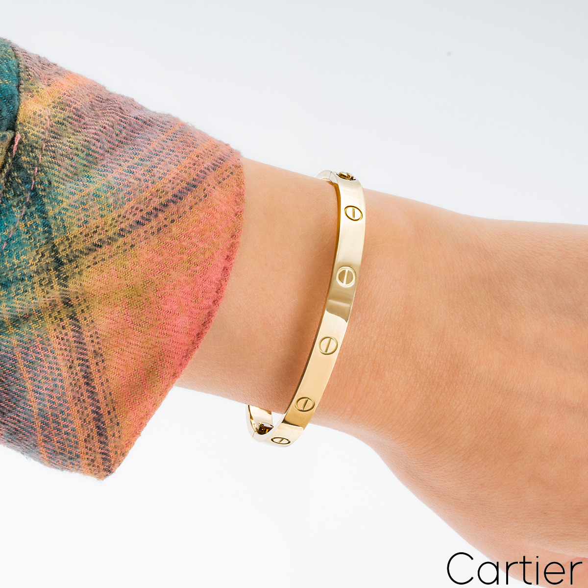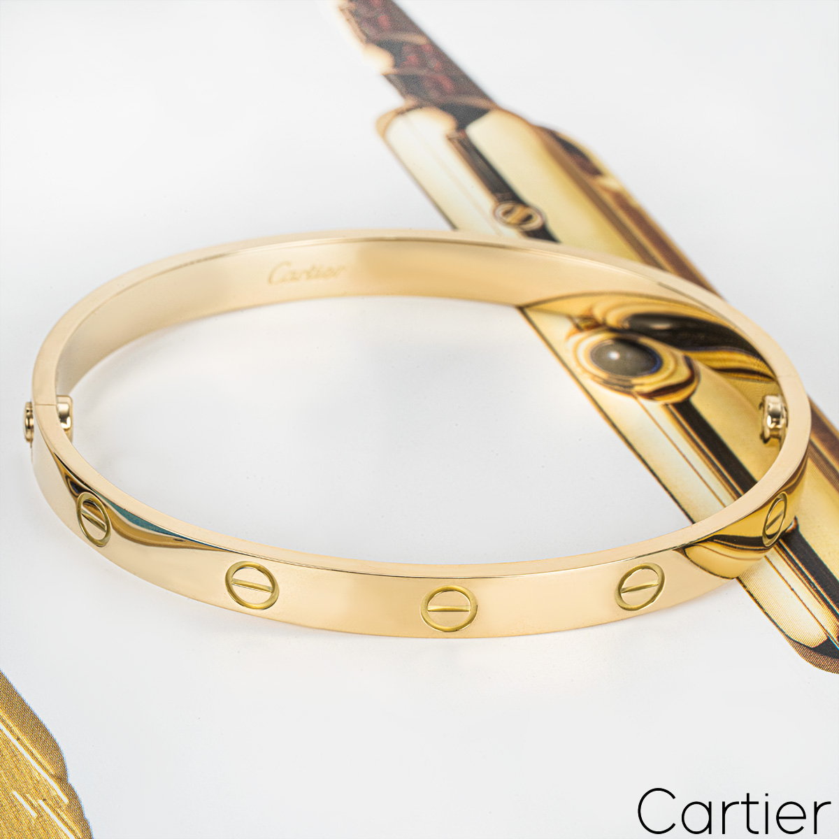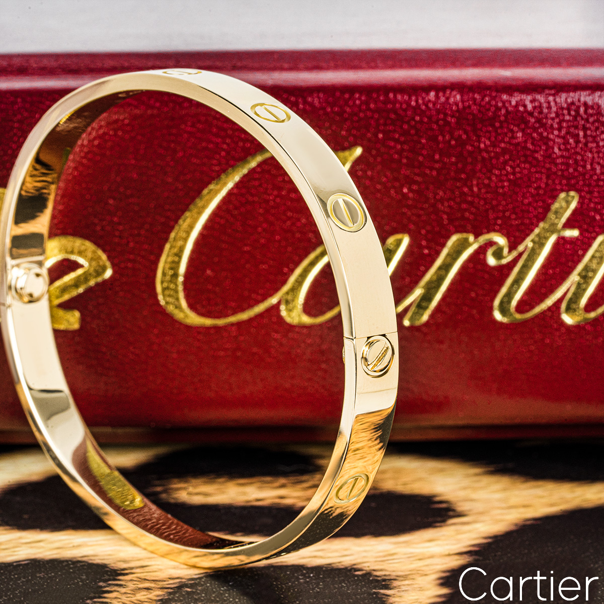 An 18k yellow gold Cartier bracelet from the Love collection. The bracelet has the screw motif displayed around the outer edge and features the new style screw fitting. This bracelet is a size 19 and has a gross weight 35.1 grams.