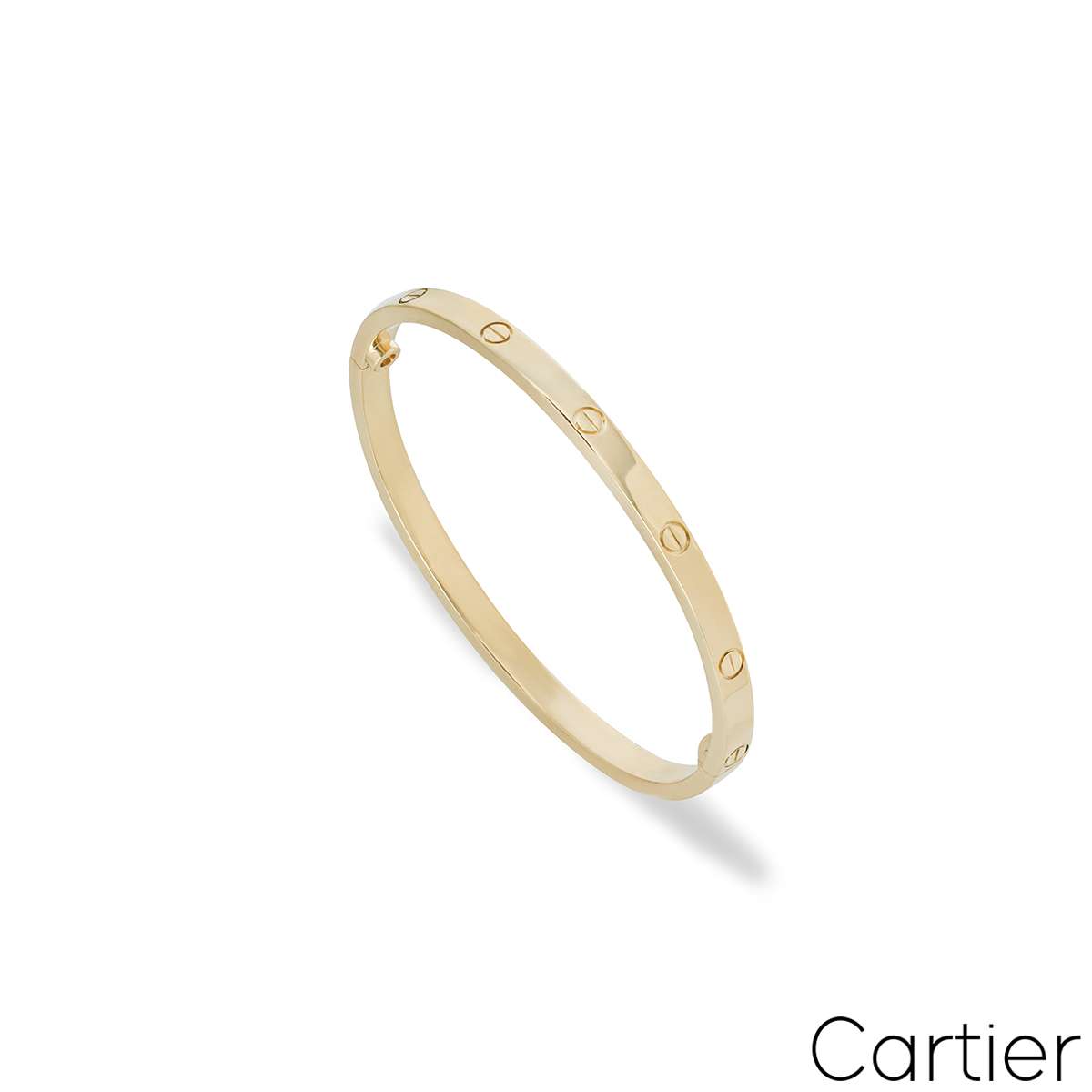 A timeless 18k yellow gold Cartier bracelet from the Love collection. This slimmer version of the classic Love bracelet comprises of the iconic screw motifs and features a single screw and hinge fitting. The bracelet is a size 17, measures 3.65mm in width and has a gross weight of 19.3 grams.