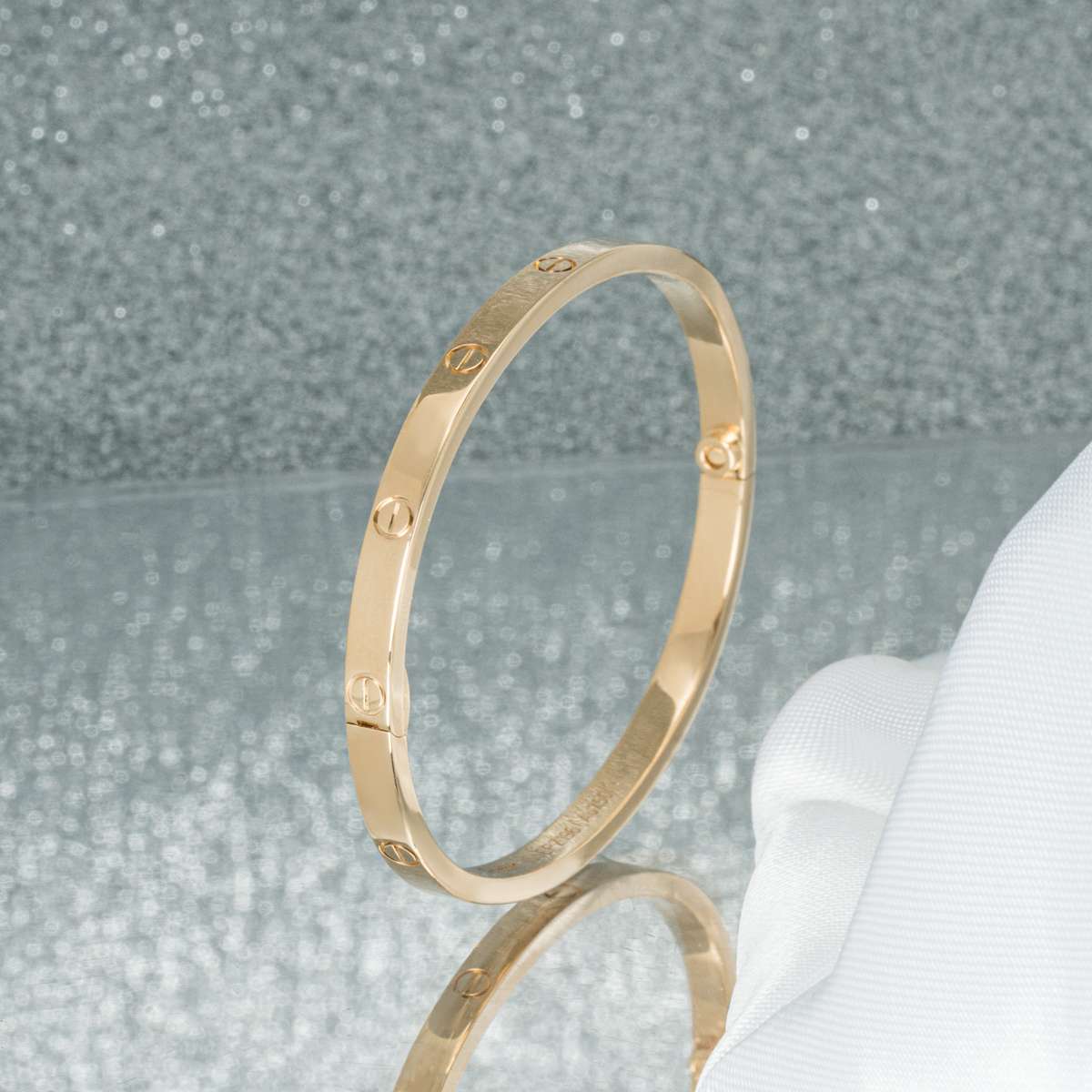 A timeless 18k yellow gold Cartier bracelet from the Love collection. This slimmer version of the classic Love bracelet comprises of the iconic screw motifs and features a single screw and hinge fitting. The bracelet is a size 18, measures 3.65mm in width and has a gross weight of 19.60 grams.