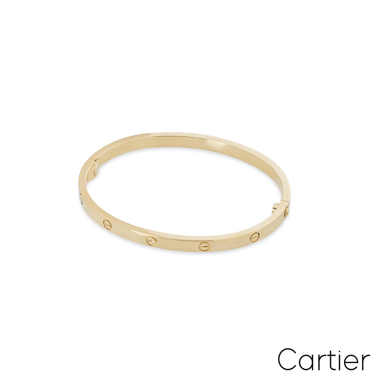 A timeless 18k yellow gold Cartier bracelet from the Love collection. This slimmer version of the classic Love bracelet comprises of the iconic screw motifs and features a single screw and hinge fitting. The bracelet is a size 18, measures 3.65mm in width and has a gross weight of 20.00 grams.